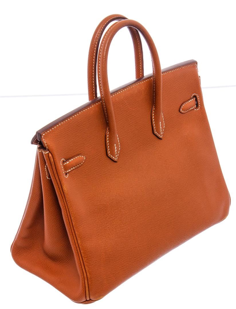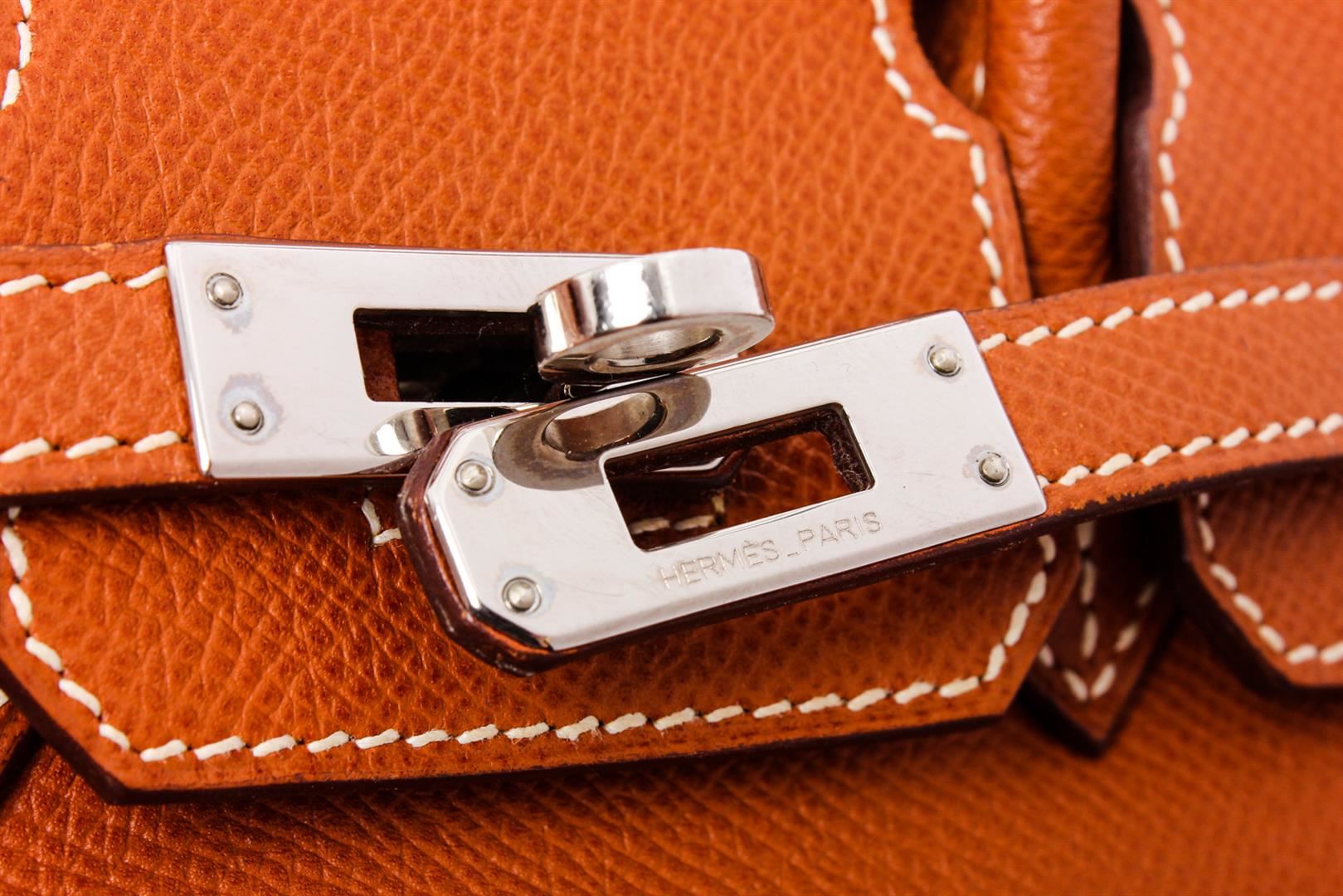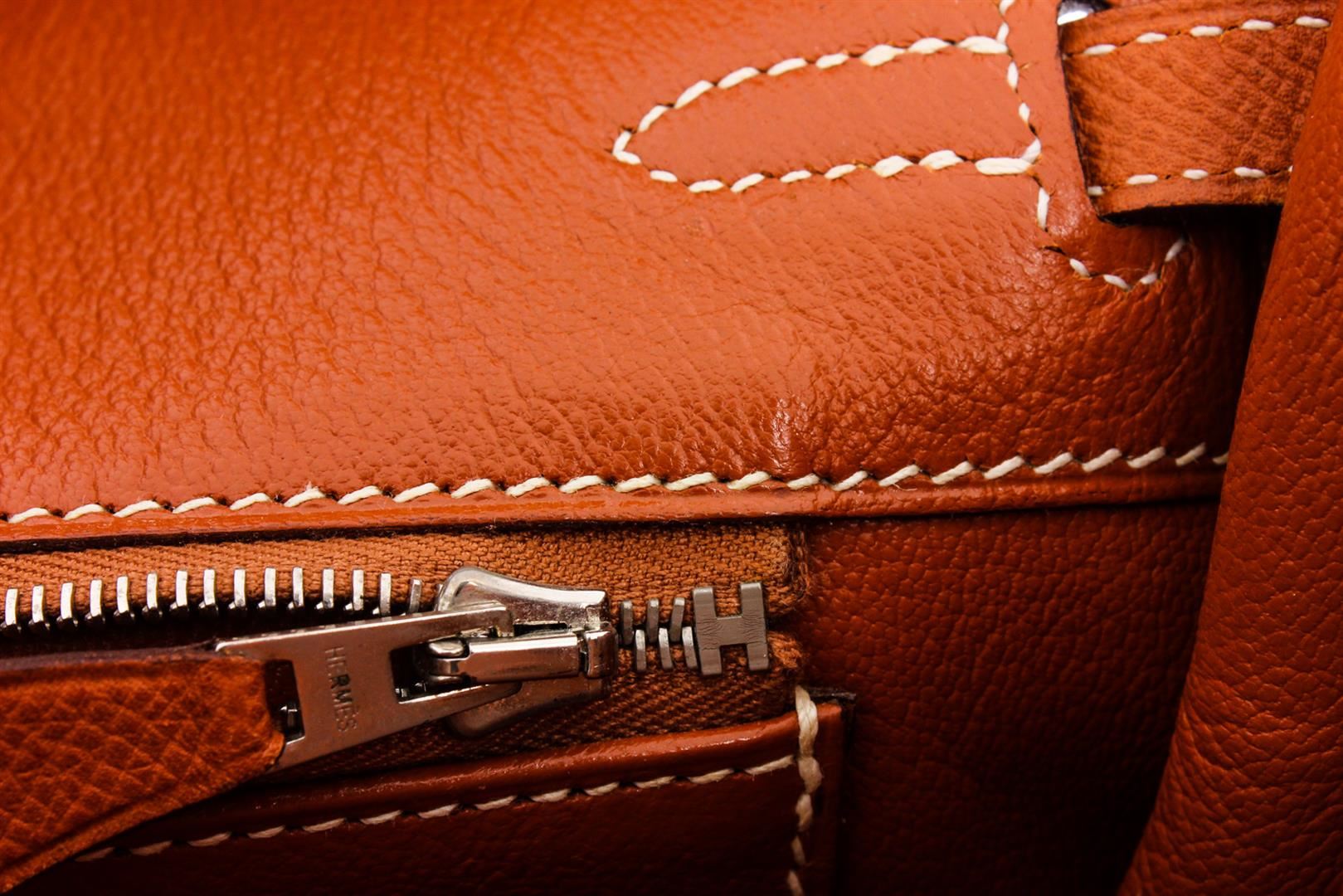 Brown Togo leather Hermes Birkin 25 with palladium-plated hardware, dual rolled top handles, sangle expansions at sides, foil stamped logo at flap underside, tonal leather lining, dual pockets at interior wall; one with zip closure and turn-lock closure at front flap.