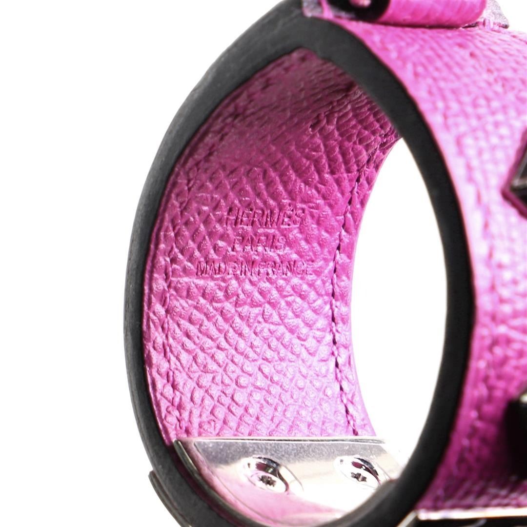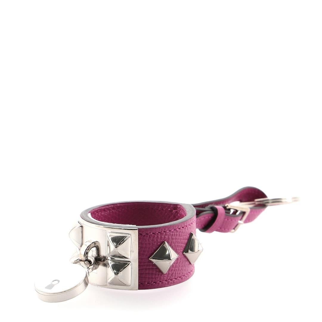 Hermes Collier de Chien Keychain Purple Leather/Metal. Brand: Hermes, Style: Collier de Chien, Type: Keychain, Exterior Color: Purple, Exterior Material: Leather/Metal, Closure: Key Ring, Handle/Strap Type: Removable strap/Key Ring, Length: 5.5", Width: 1". Condition: Very Good, plastic on hardware. Additional Information: Metal Studs throughout with lock charm. Item is sold AS-IS and all information pertaining to this lot is available in the photos or this description.