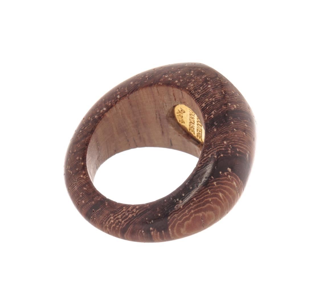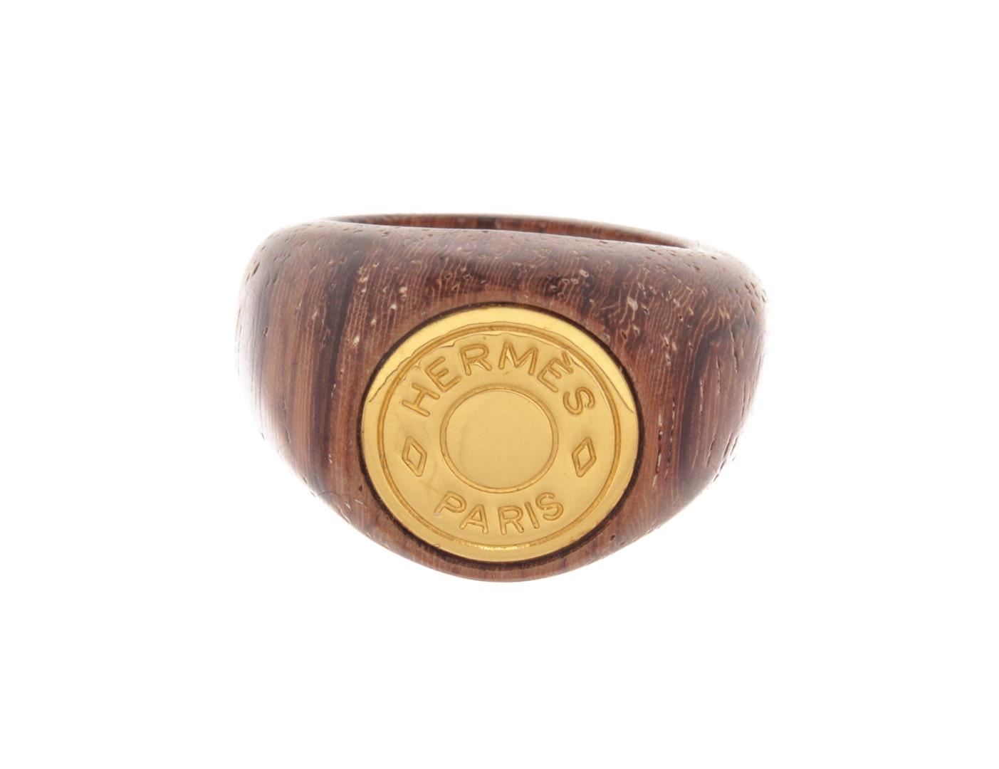 Hermes Dark Brown and Gold Wood Metal Selle Ring. All available information is listed in the description and shown in the photos. Hermes Dark Brown and Gold Wood Metal Selle Ring with gold-tone hardware, 18 karat stamped signet on wood ring, ring in rosewood wood saddle stud gold.