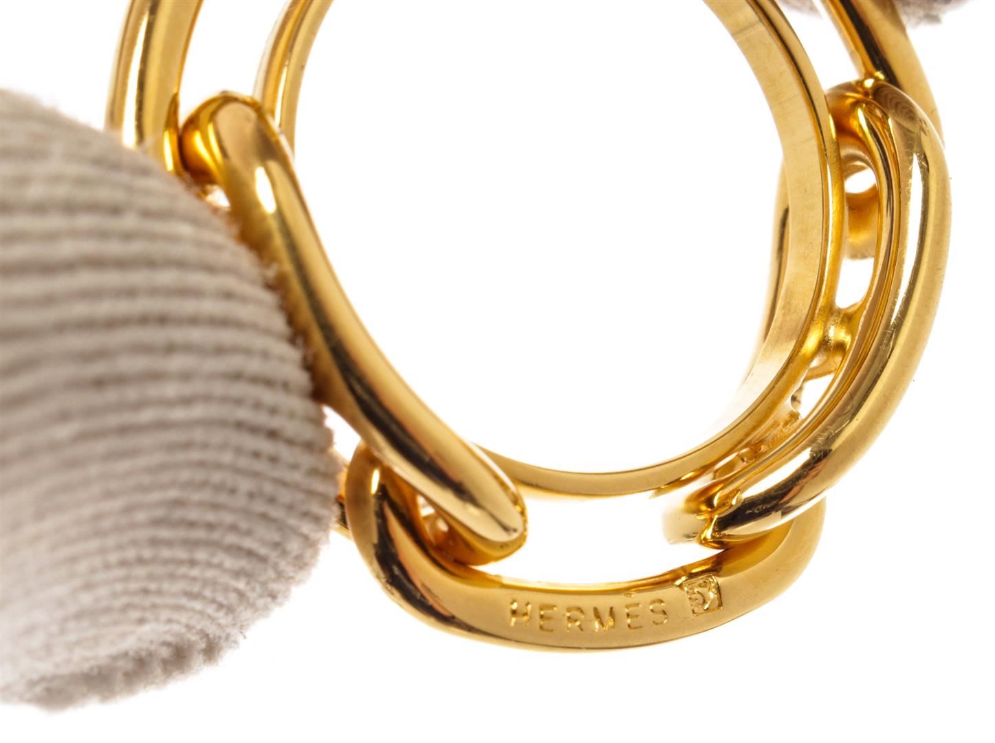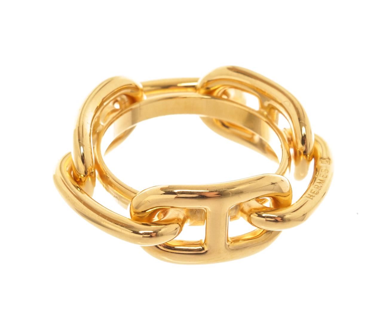 Hermes Gold Plated Metal Chaine D'ancre Scarf Ring. All available information is listed in the description and shown in the photos. Hermes Gold Plated Metal Chaine D'ancre Scarf Ring with this scarf ring is crafted of plated gold small chaine d ancre, constructed in gold plated metal, inner band with different strands looped together, gold-tone hardware.