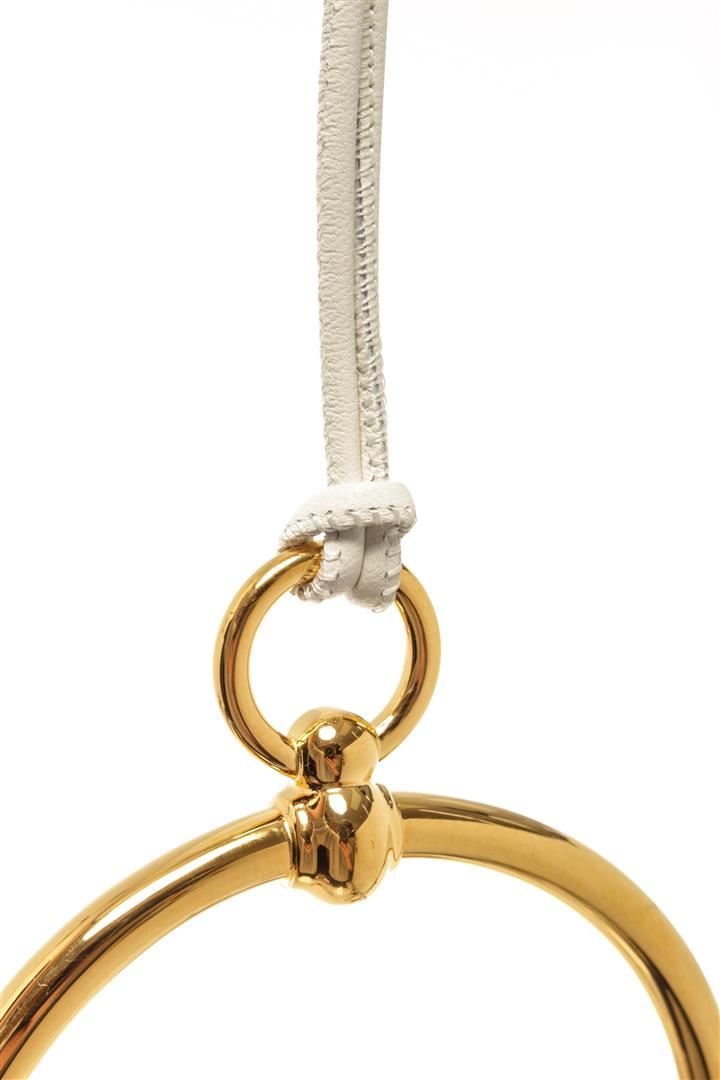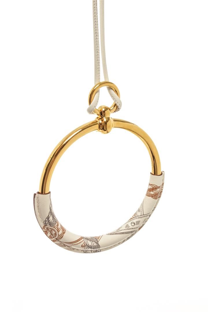 One Hermes Gold White Loup Gran Pendant. Item is sold AS-IS. All available information is listed in the description and shown in the photo. Hermes gold and white Loup Gran pendant with printed white calfskin, gold-plated pendant, and string around it.