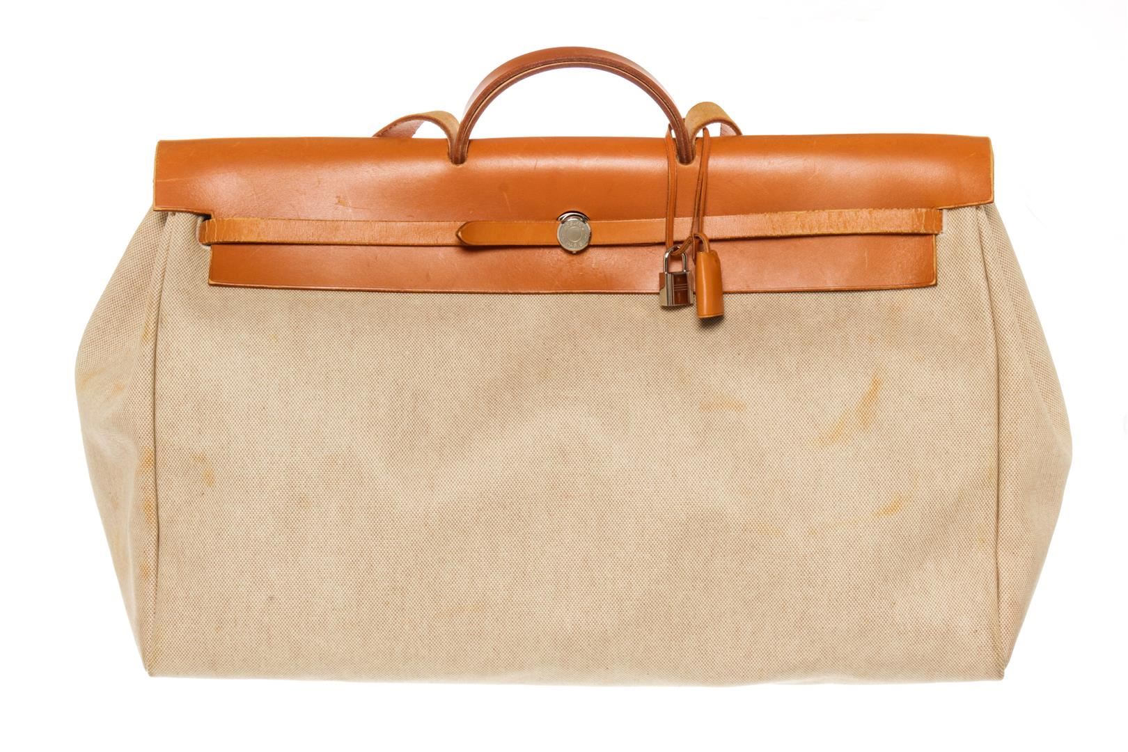 Hermes Her Bag GM. All available information is listed in the description and shown in the photos. Hermes Her Bag GM Beige Canvas Tan Leather. Features silver hardware, tan leather handles, beige canvas exterior, and a silver button closure.