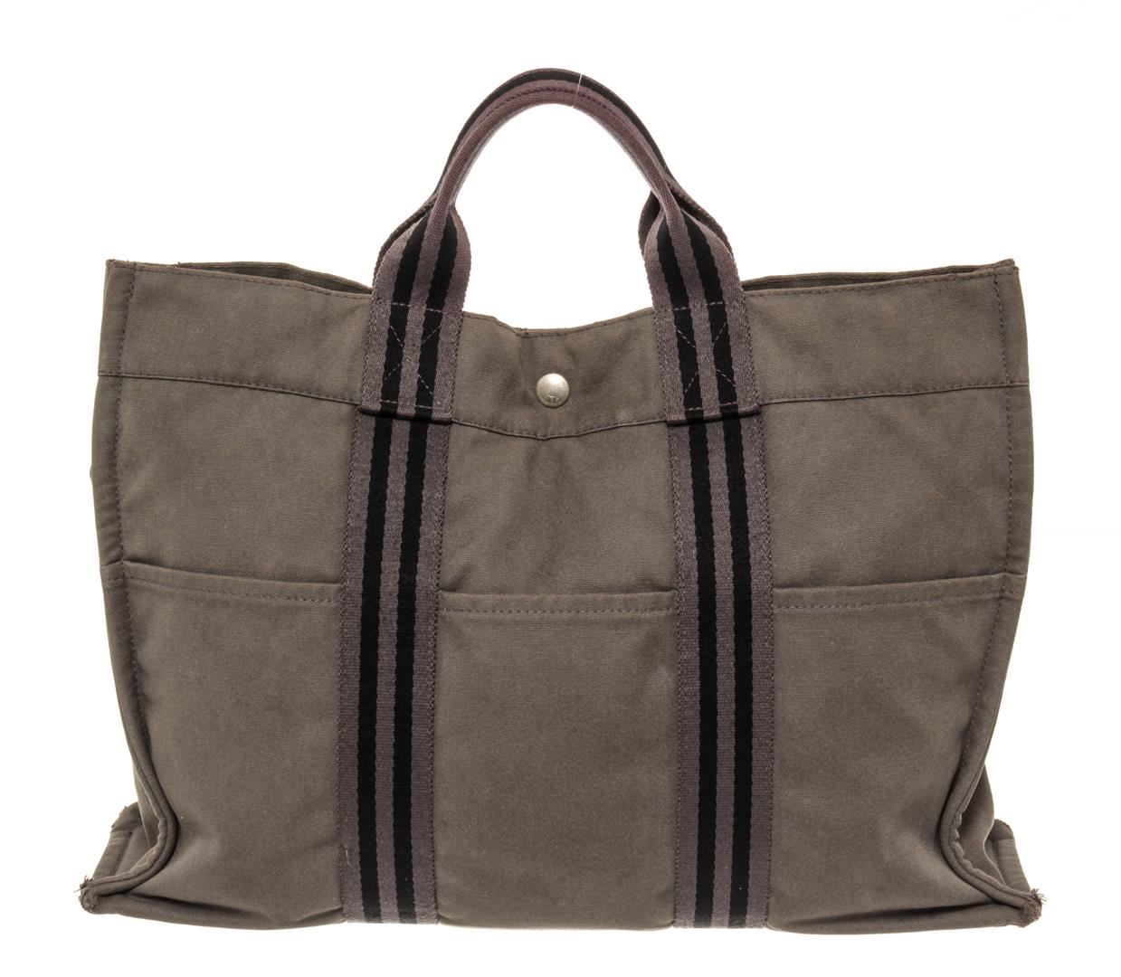 Hermes Herline GM. All available information is listed in the description and shown in the photos. Hermes Herline GM Grey Canvas. Features silver hardware, grey canvas straps, grey canvas interior, and a gold zipper closure.