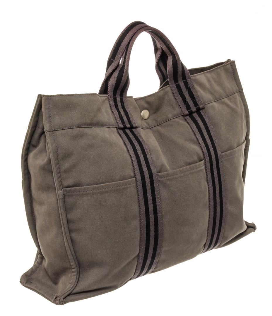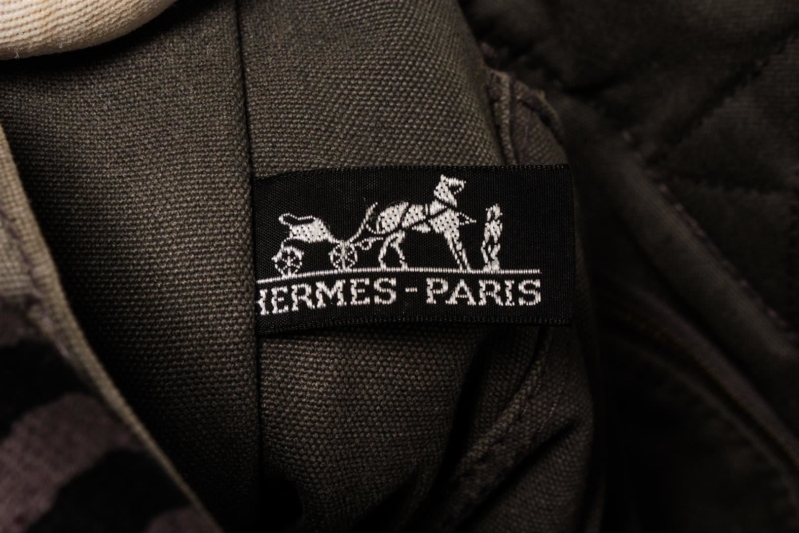 Hermes Herline GM. All available information is listed in the description and shown in the photos. Hermes Herline GM Grey Canvas. Features silver hardware, grey canvas straps, grey canvas interior, and a gold zipper closure.