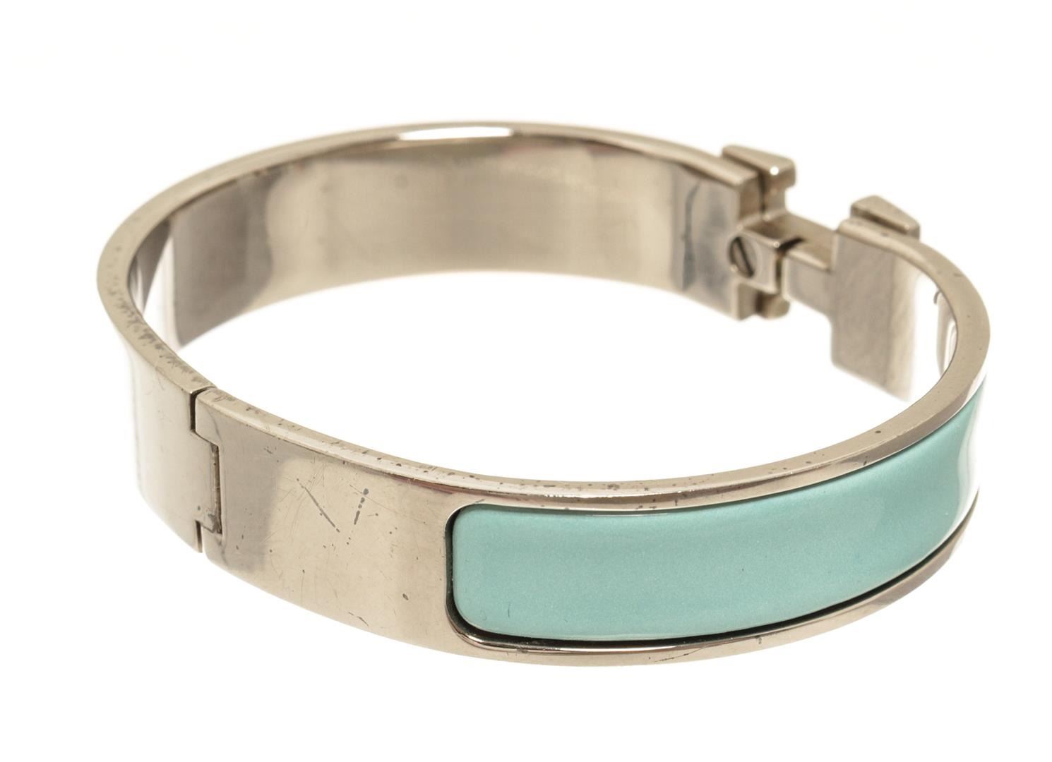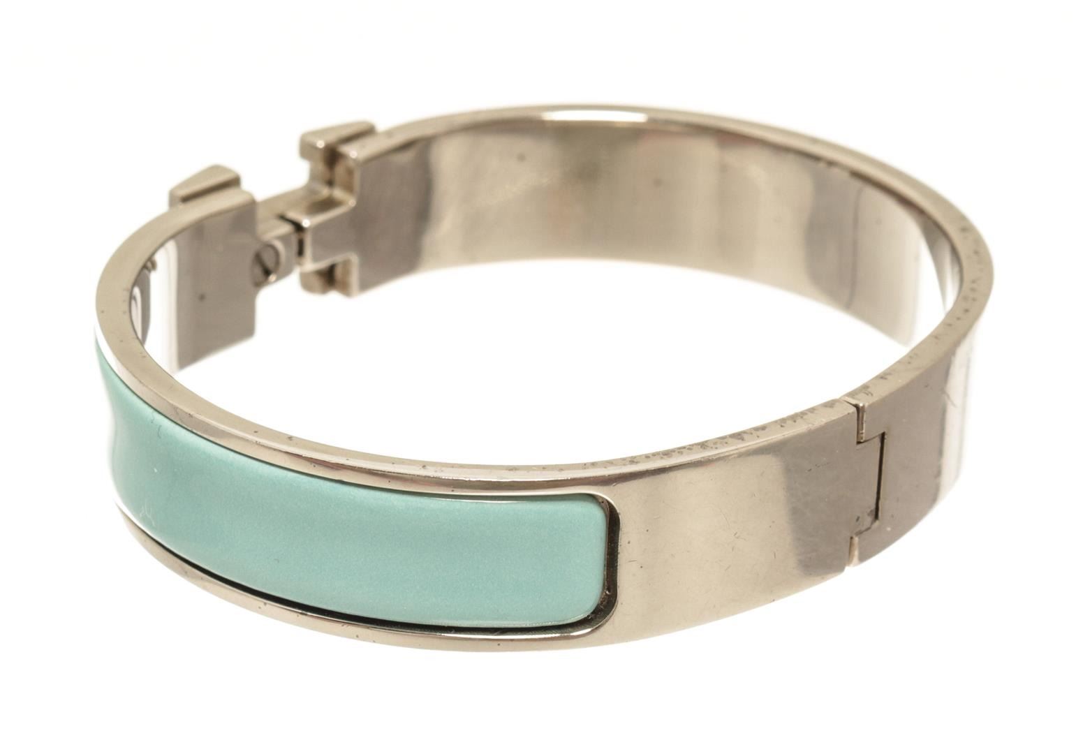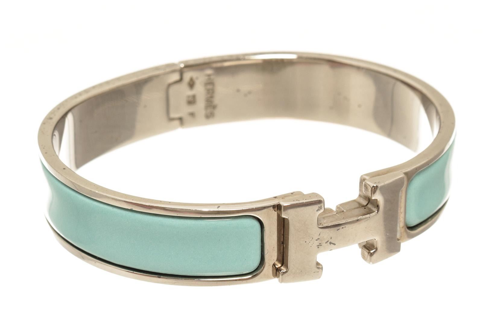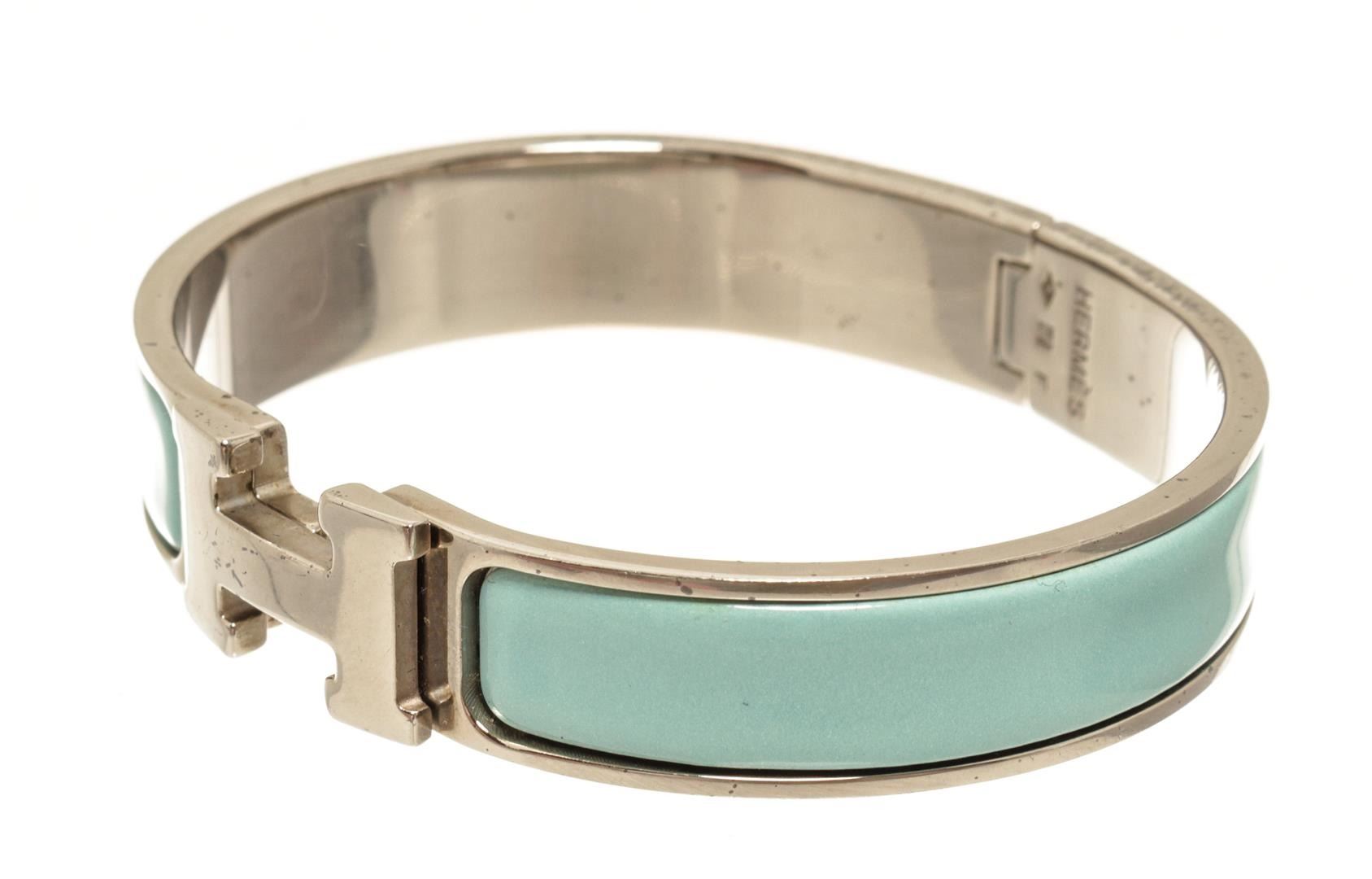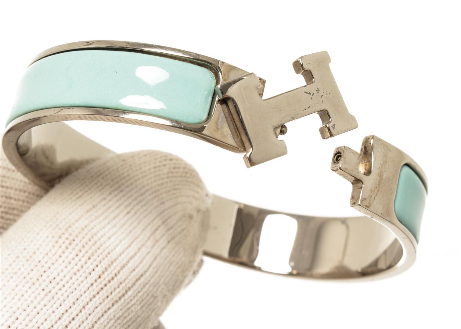 One Hermes Palladium Clic Clac H Bangle. Item is sold AS-IS. All available information is listed in the description and shown in the photo. Hermes Palladium Clic Clac H Bangle with palladium hardware, enamel, front clasp h closure