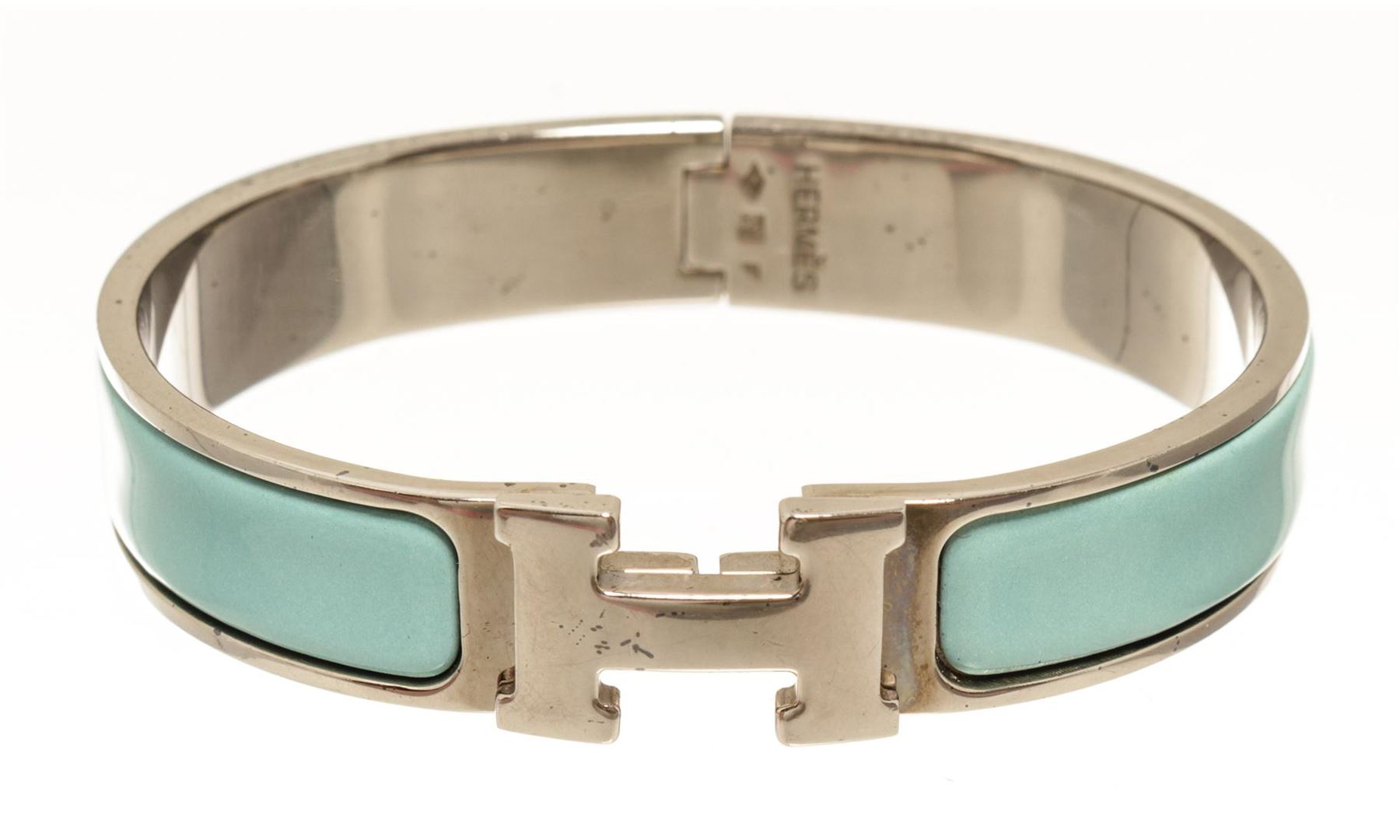 One Hermes Palladium Clic Clac H Bangle. Item is sold AS-IS. All available information is listed in the description and shown in the photo. Hermes Palladium Clic Clac H Bangle with palladium hardware, enamel, front clasp h closure