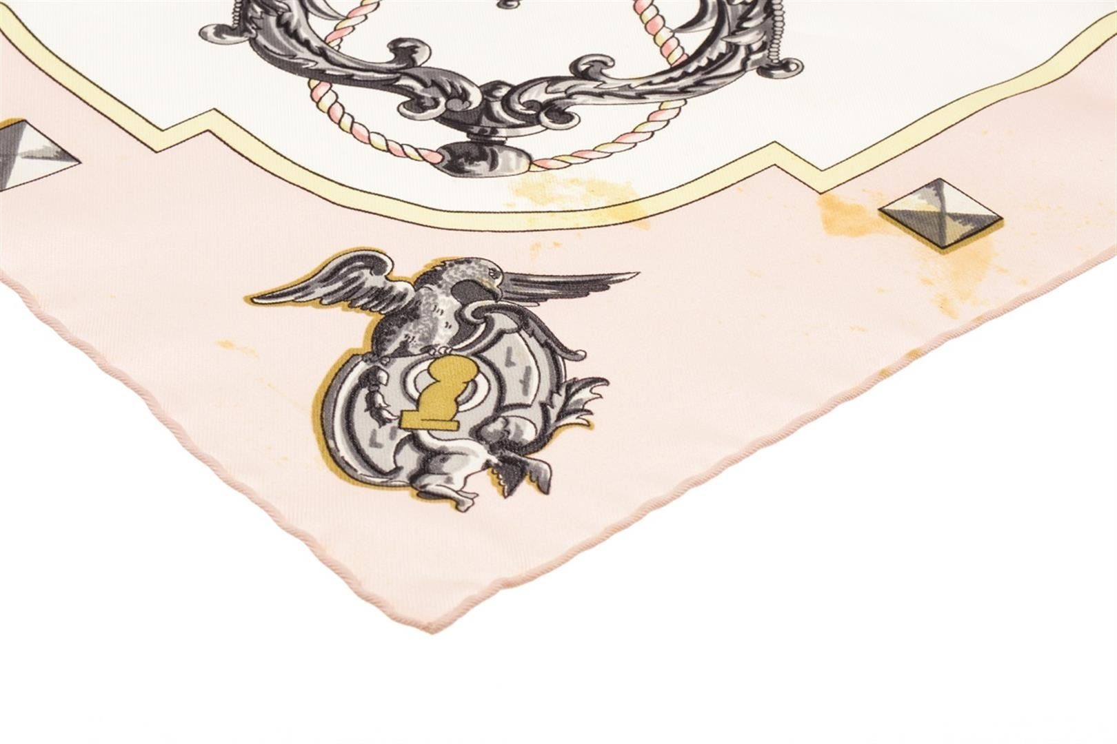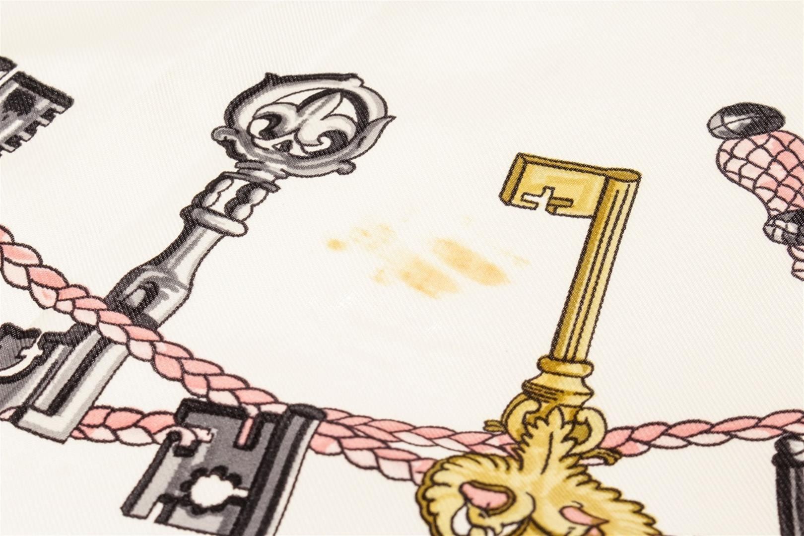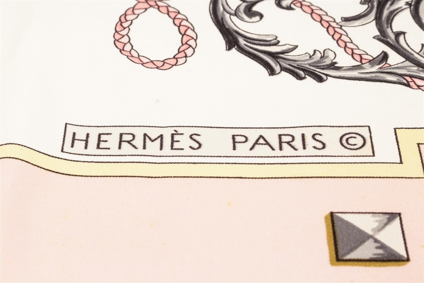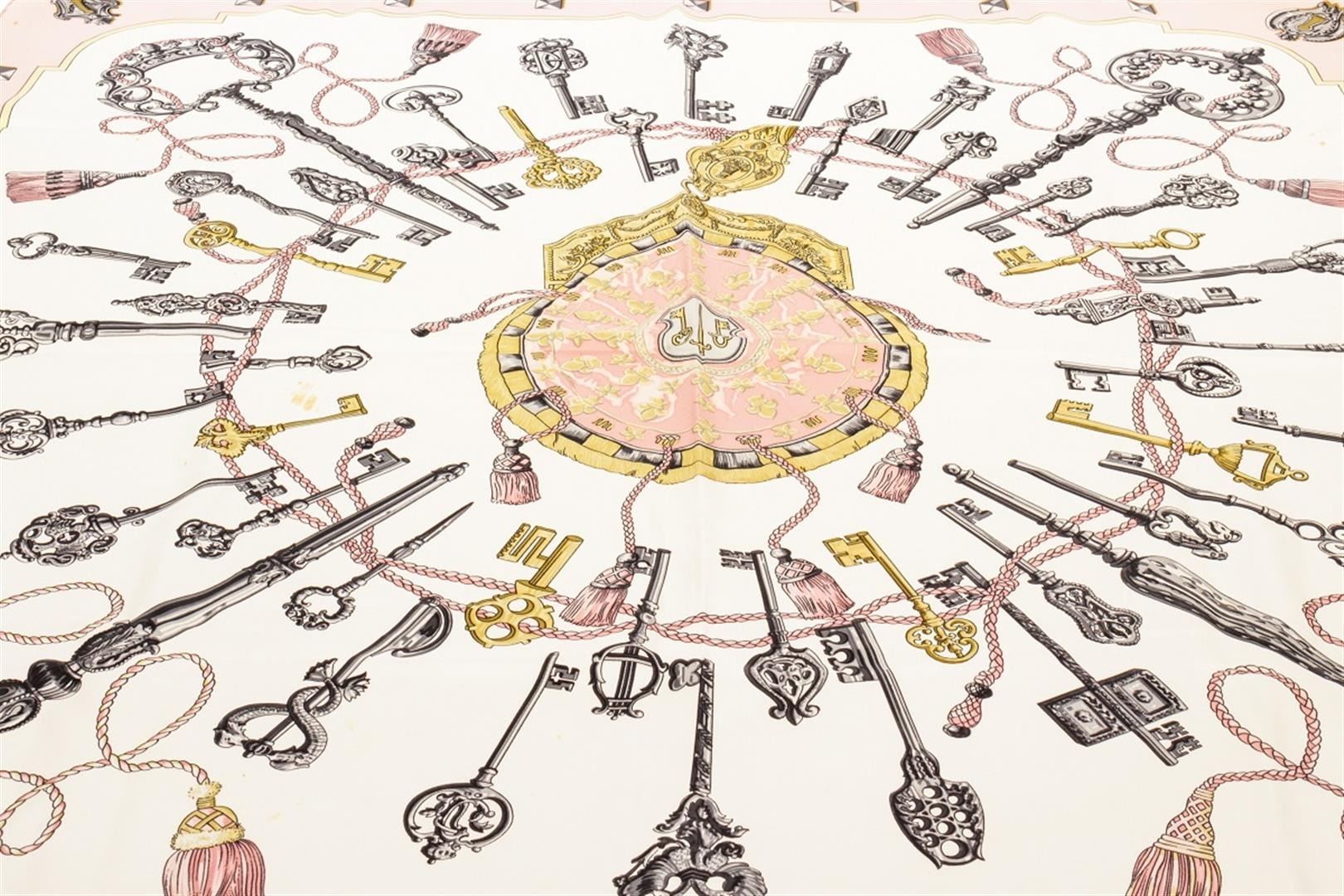 Hermes Pink White Print Silk Scarf. All available information is listed in the description and shown in the photos. hermes pink white print silk scarf with features a printed silk body,neutrals, 90cm with les clés motif, featuring hand-rolled edges. Length: 35" Width: 35"