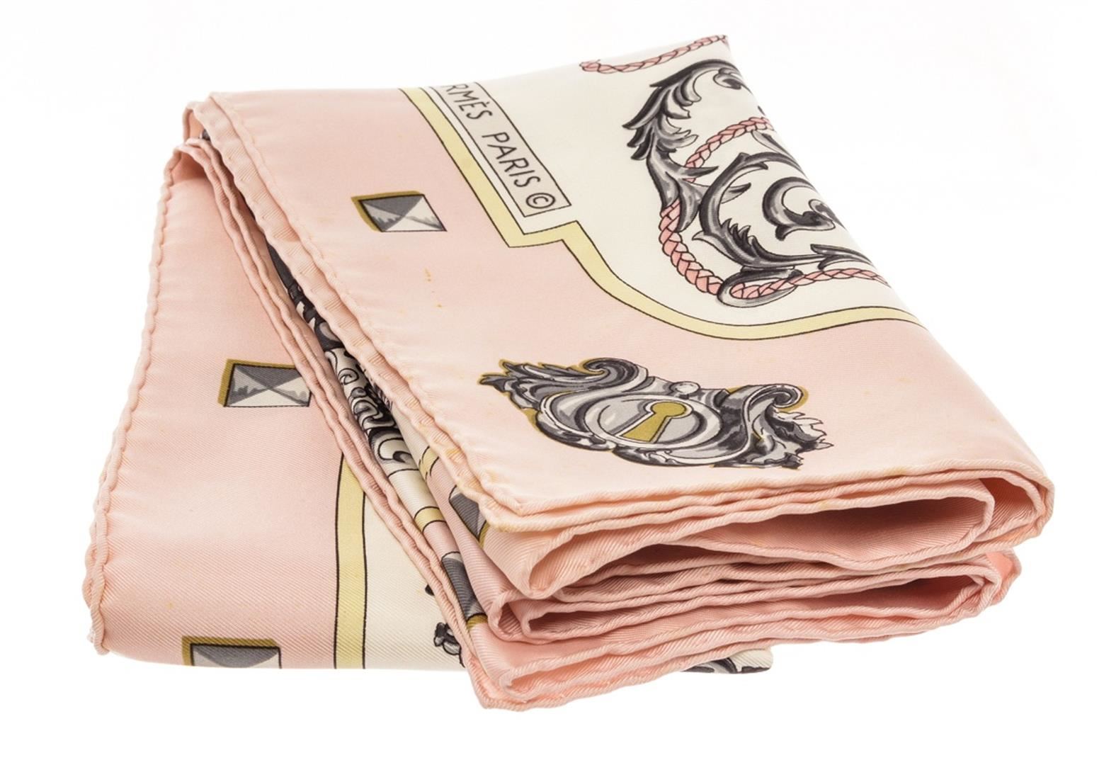 Hermes Pink White Print Silk Scarf. All available information is listed in the description and shown in the photos. hermes pink white print silk scarf with features a printed silk body,neutrals, 90cm with les clés motif, featuring hand-rolled edges. Length: 35" Width: 35"