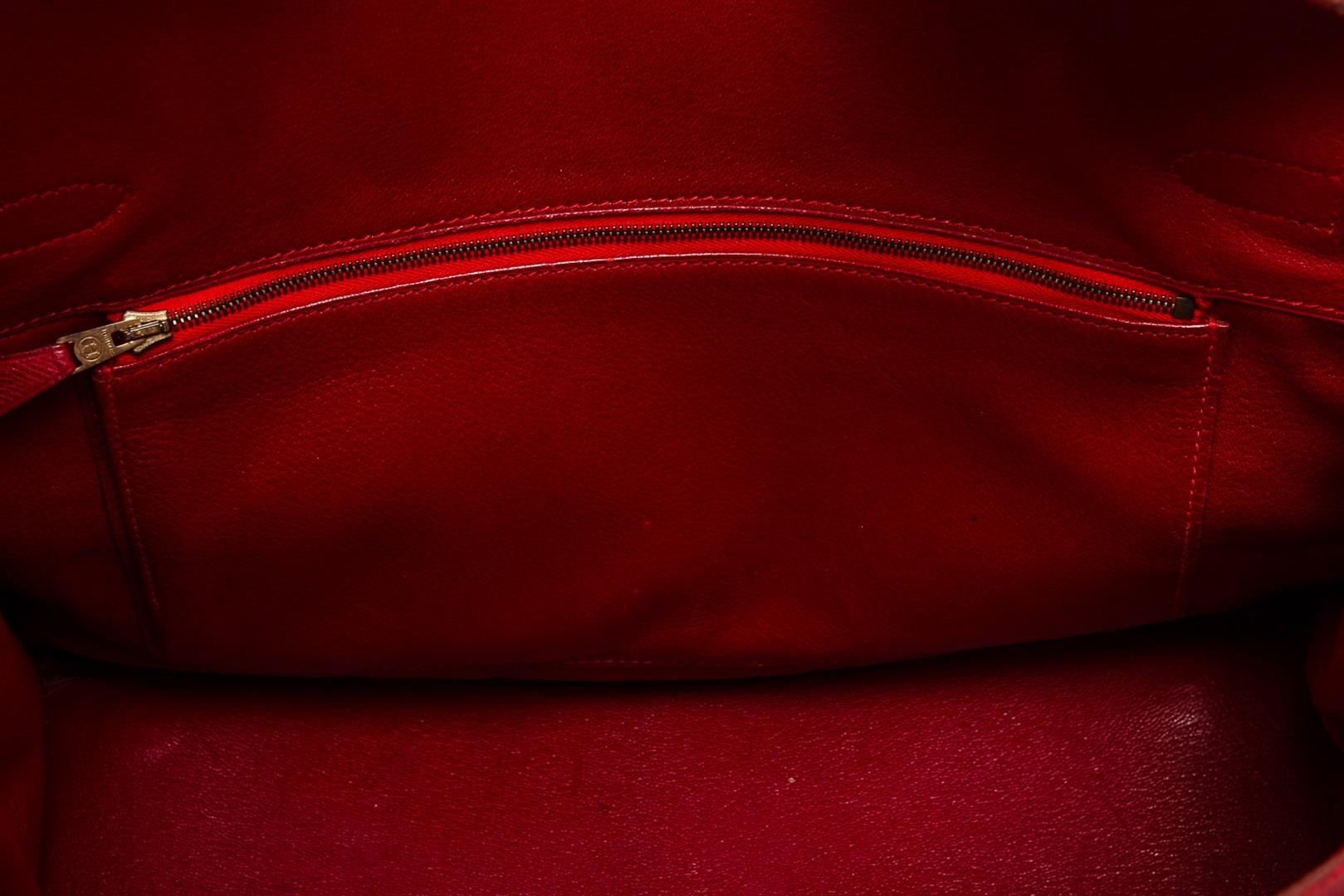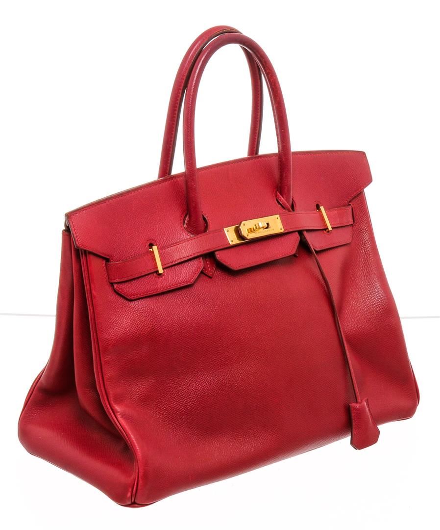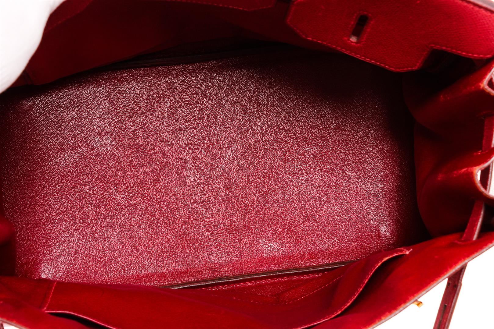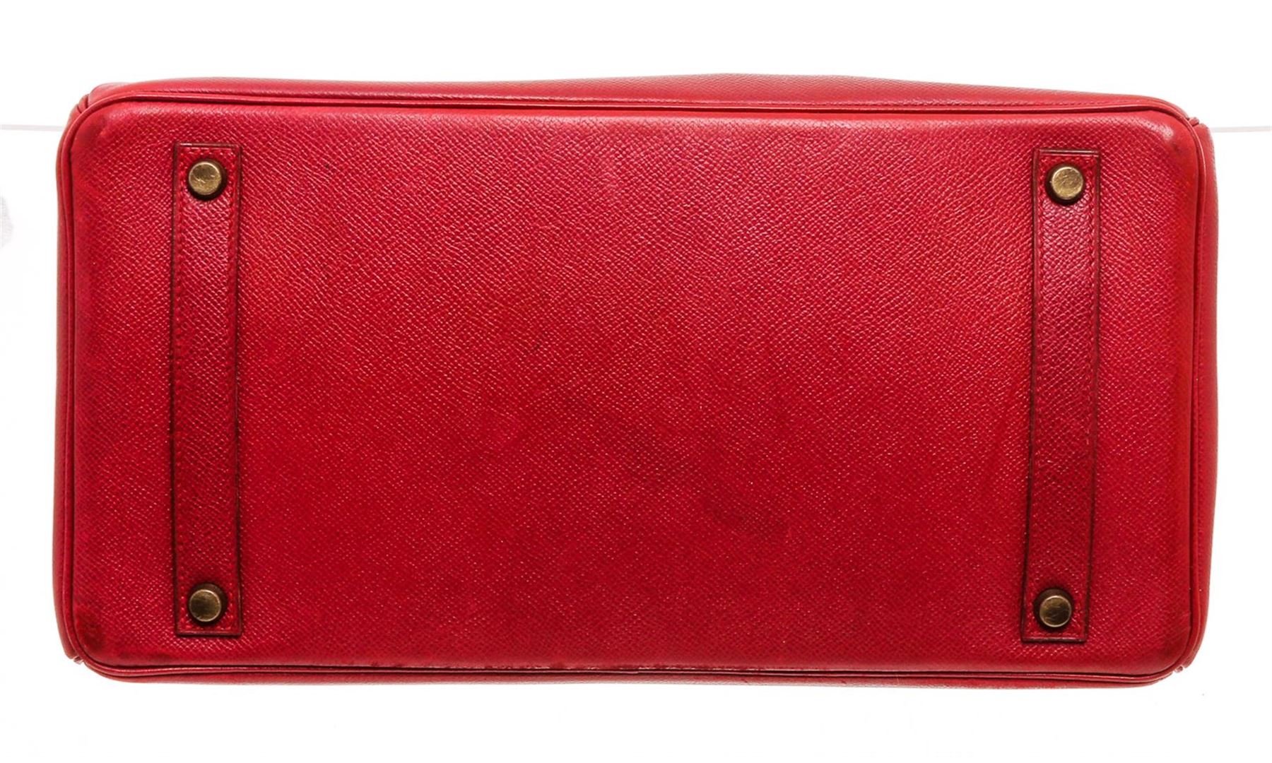Red Ardennes leather Hermes Birkin 35 with gold-plated hardware, dual rolled top handles, sangle expansions at sides, foil stamped logo at flap underside, tonal leather lining, dual pockets at interior wall; one with zip closure and turn-lock closure at front flap.