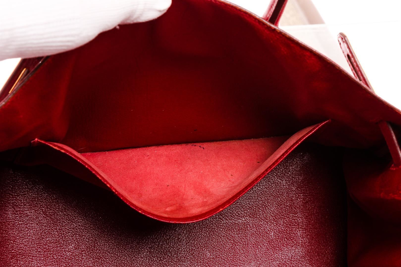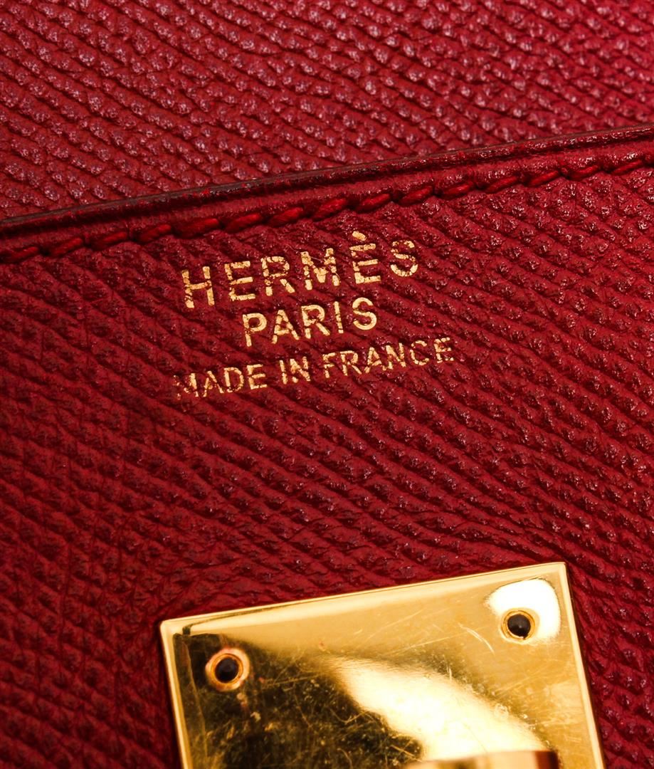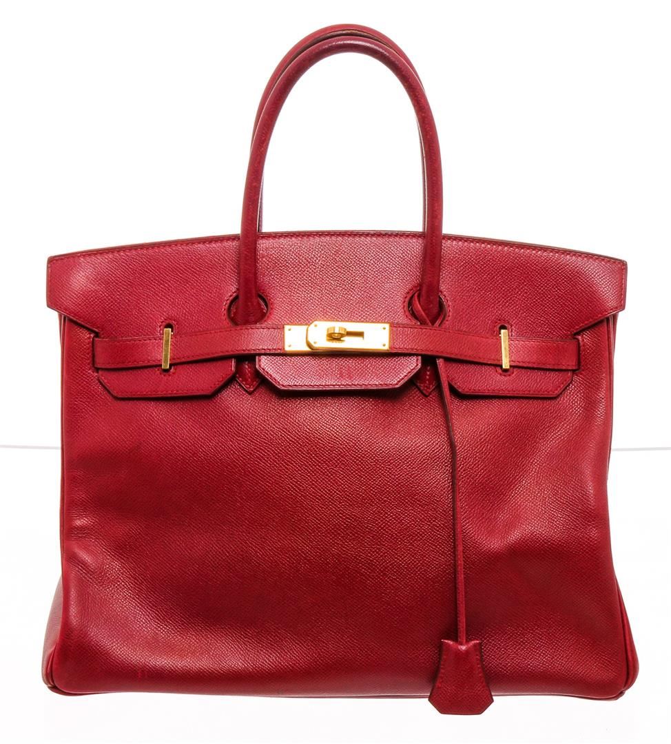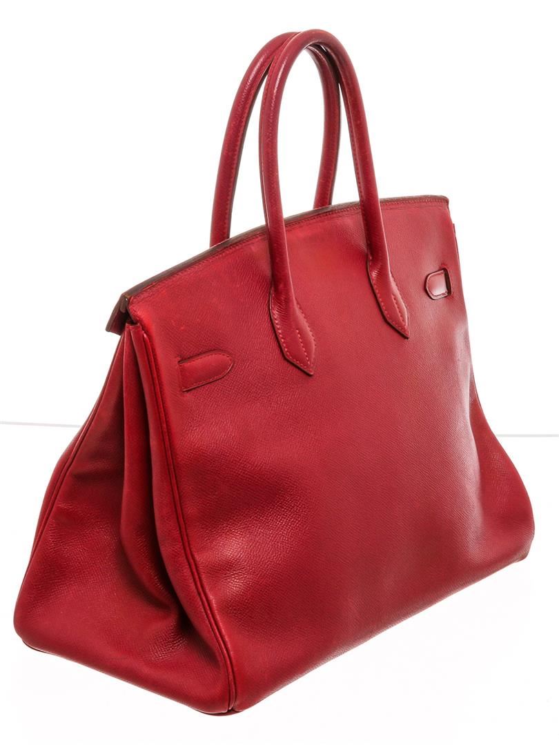 Red Ardennes leather Hermes Birkin 35 with gold-plated hardware, dual rolled top handles, sangle expansions at sides, foil stamped logo at flap underside, tonal leather lining, dual pockets at interior wall; one with zip closure and turn-lock closure at front flap.