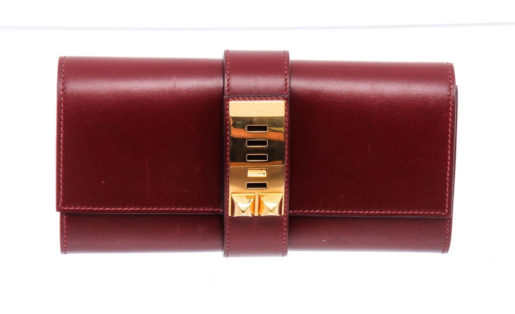 Red Box leather Hermès Medor 23 clutch with gold-plated hardware, tonal leather interior, single interior slit pocket and belted slide-lock closure at exterior.