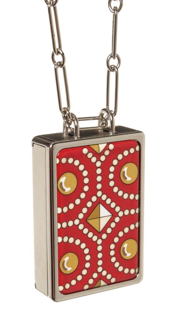 One Hermes Red Hermes Boite a Reves. Item is sold AS-IS. All available information is listed in the description and shown in the photo. Hermes Red Hermes Boite a Reves with palladium plated hardware, cover of this locket slides open to hold items. Made in France. Pendant size is 4.4 cm x 3 cm.