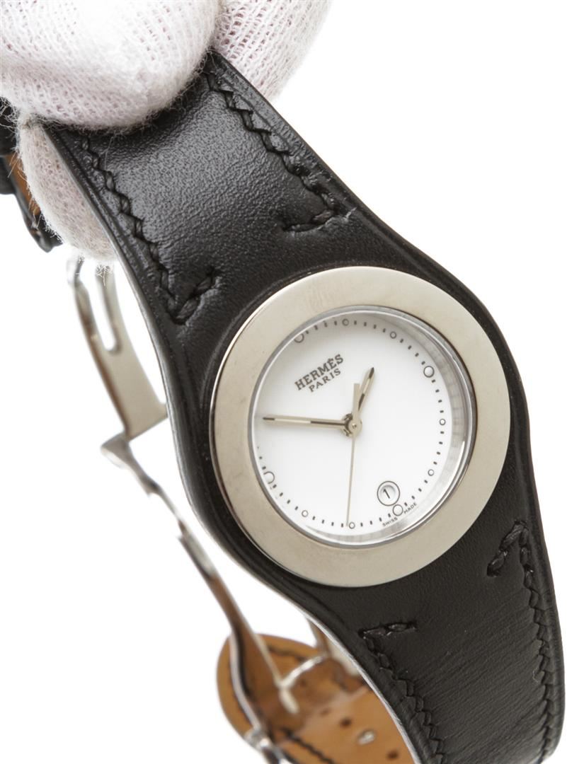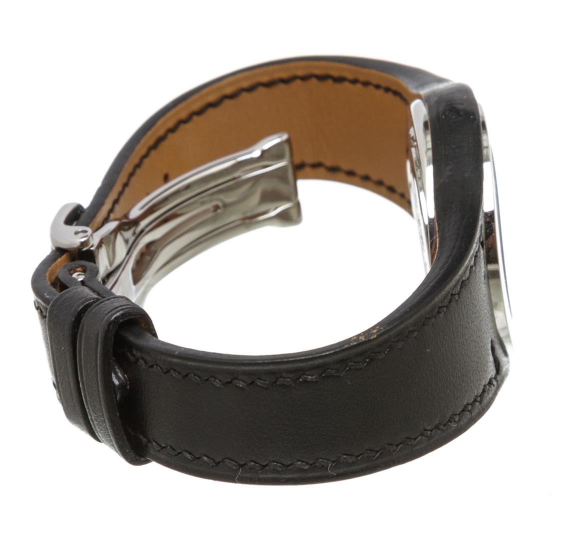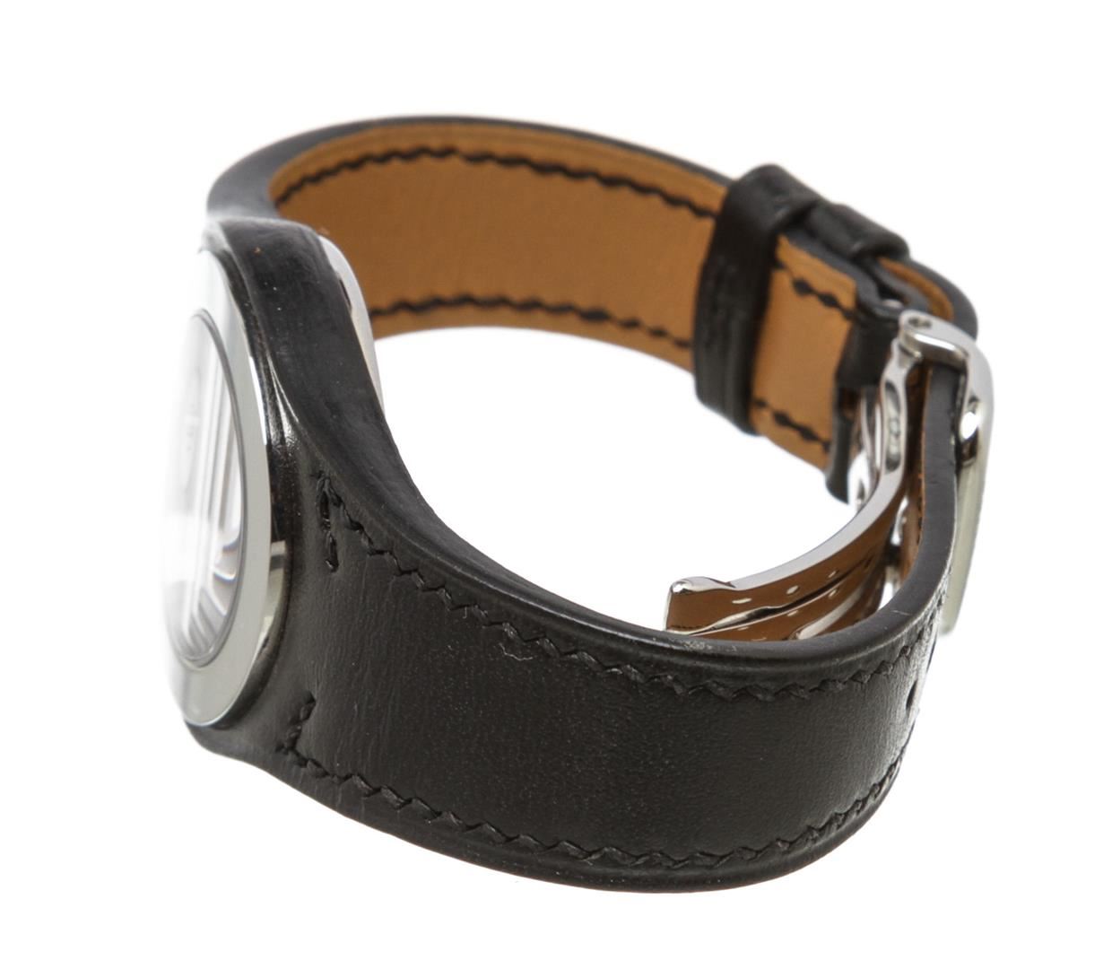 Stainless steel 30mm Hermes Harnais watch featuring a quartz movement, smooth bezel, white dial and black leather strap with tang buckle. The fit of this watch can be made larger or smaller by adjusting the buckle.