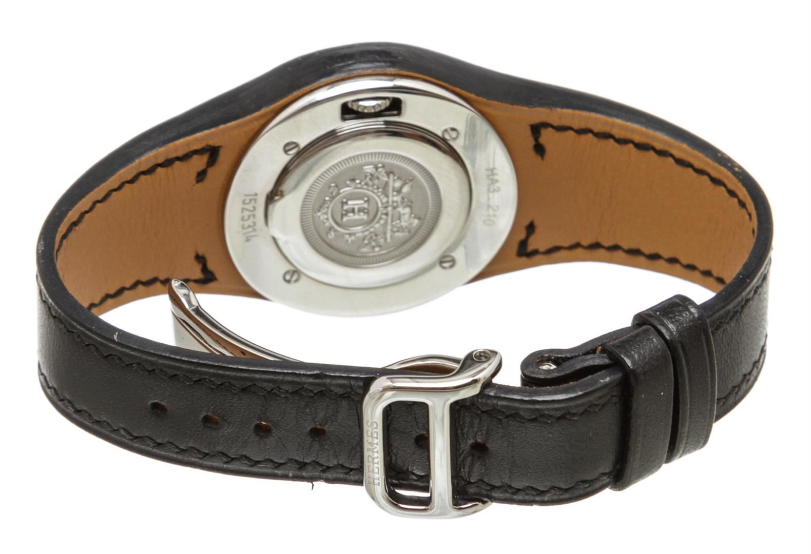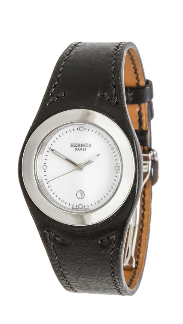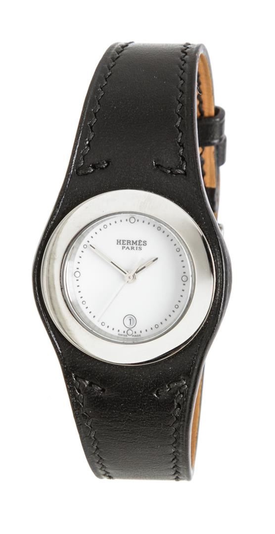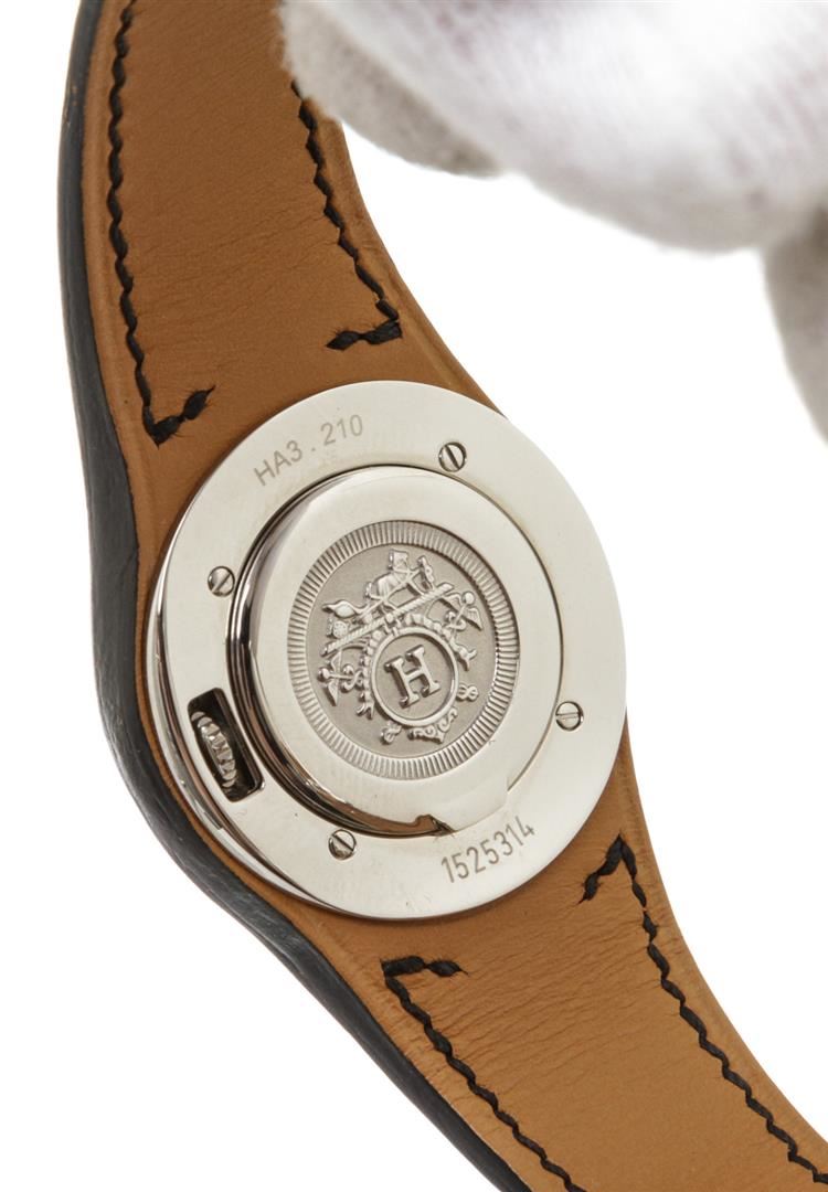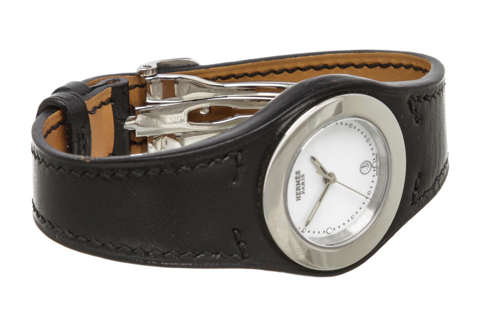 Stainless steel 30mm Hermes Harnais watch featuring a quartz movement, smooth bezel, white dial and black leather strap with tang buckle. The fit of this watch can be made larger or smaller by adjusting the buckle.