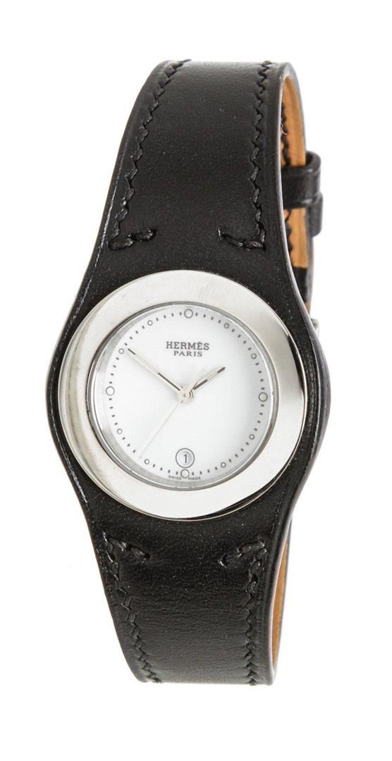 Stainless steel 30mm Hermes Harnais watch featuring a quartz movement, smooth bezel, white dial and black leather strap with tang buckle. The fit of this watch can be made larger or smaller by adjusting the buckle. Measurements: Length: 1 in / 3 cm Width: 1 in / 3 cm 1 in / 3 cm Condition: Pre-Owned Good overall, please see photographs for detail.