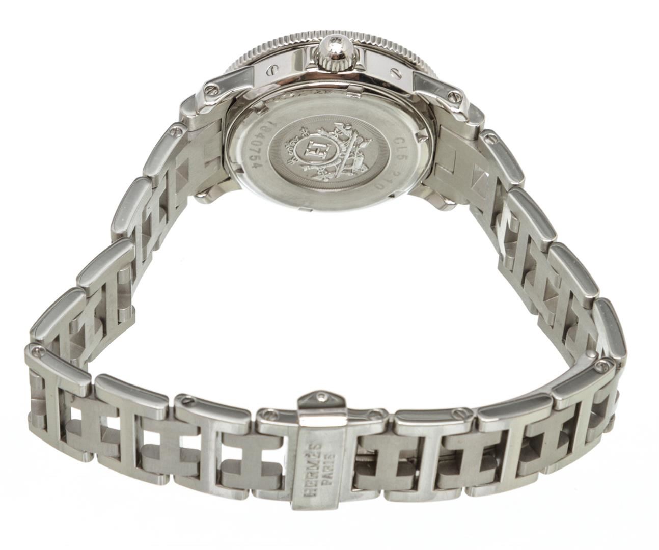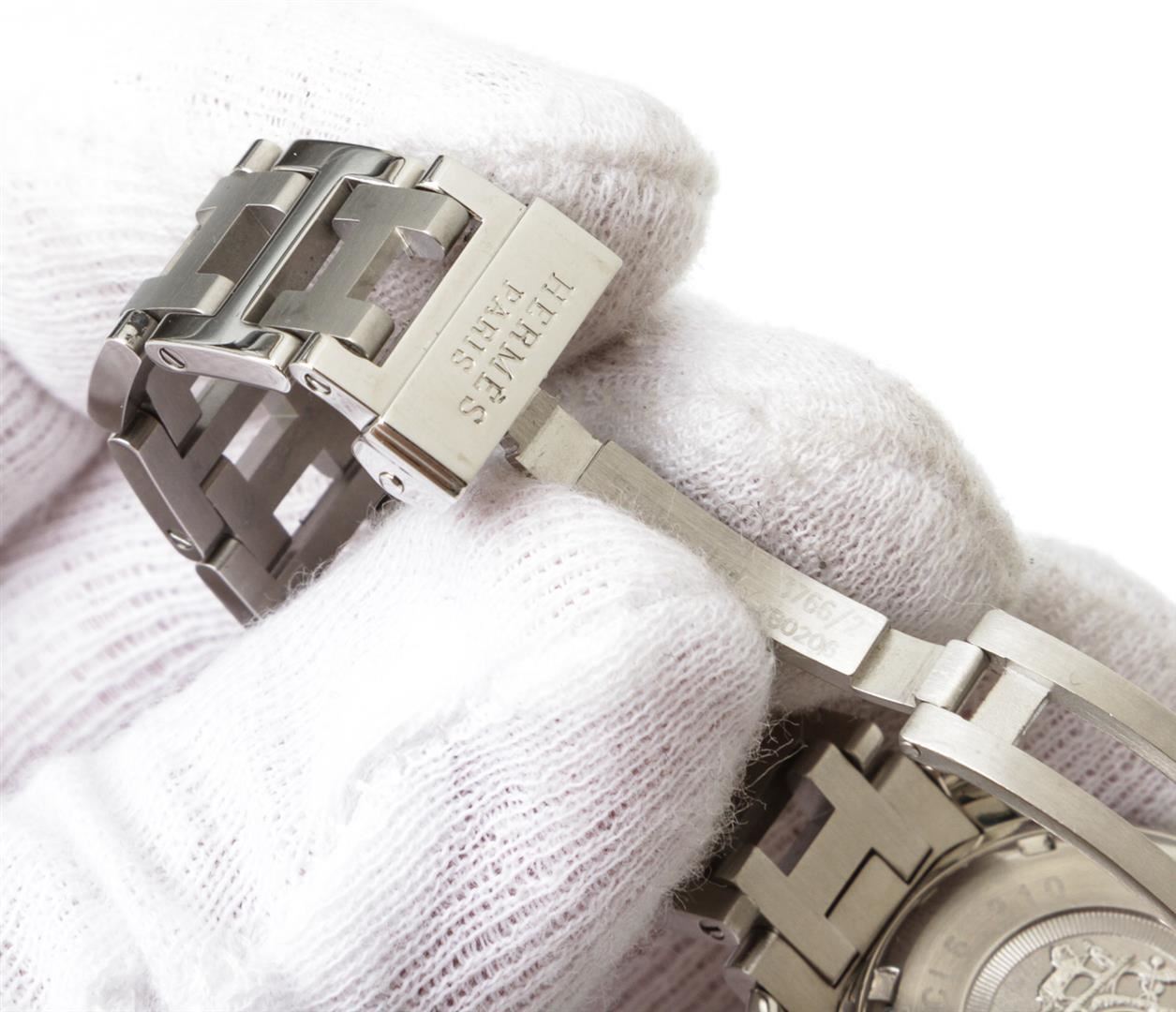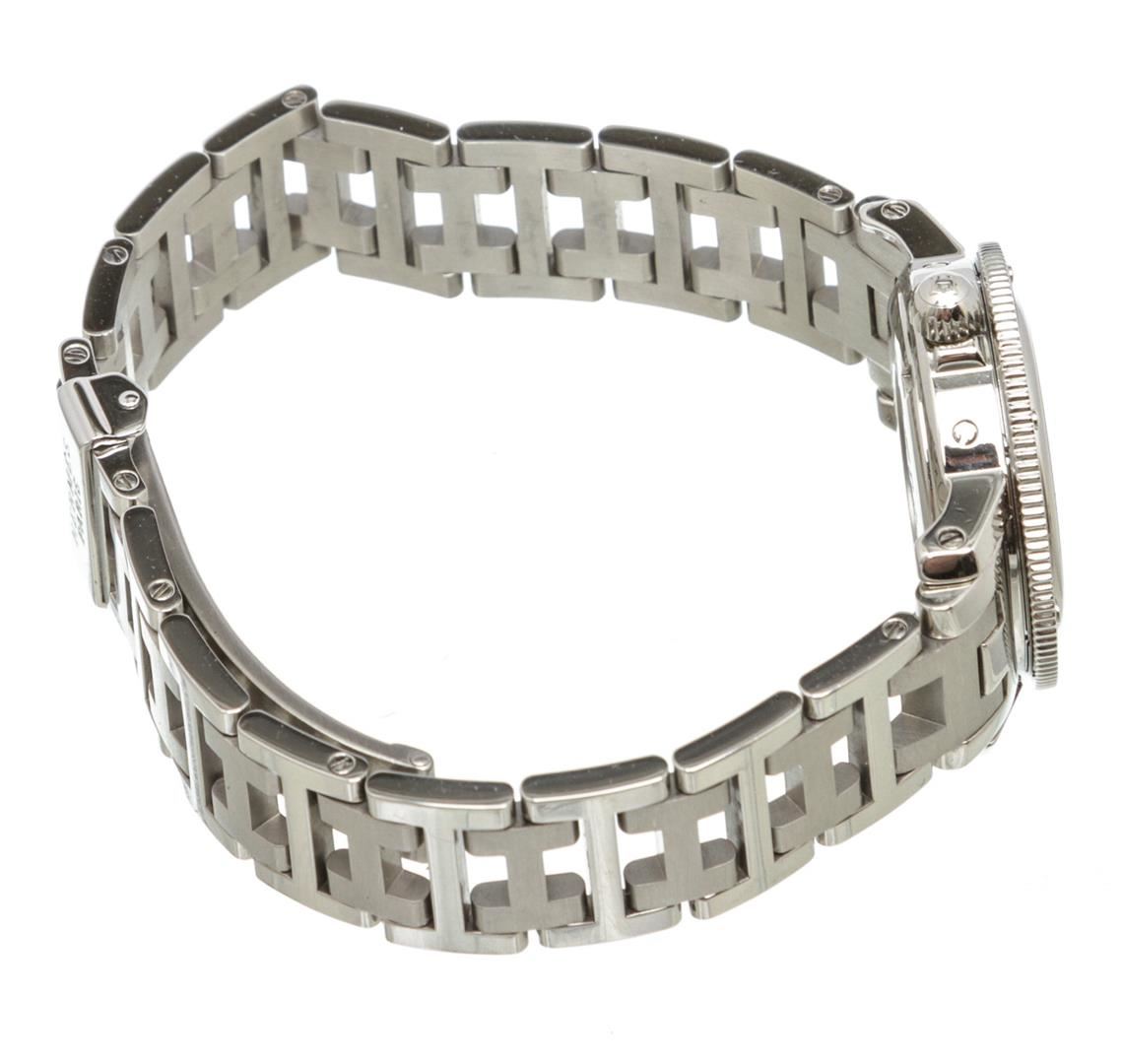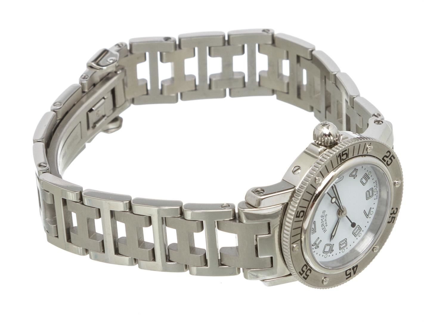 Stainless steel 27mm Hermès Clipper watch featuring a quartz movement, unidirectional rotating diver's bezel, white dial and bracelet with deployant clasp.