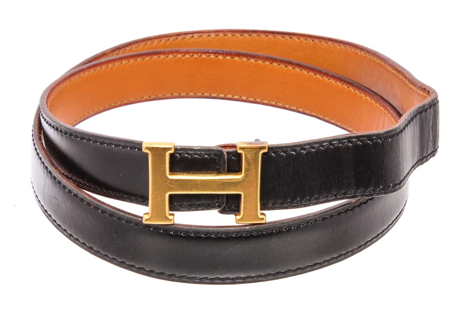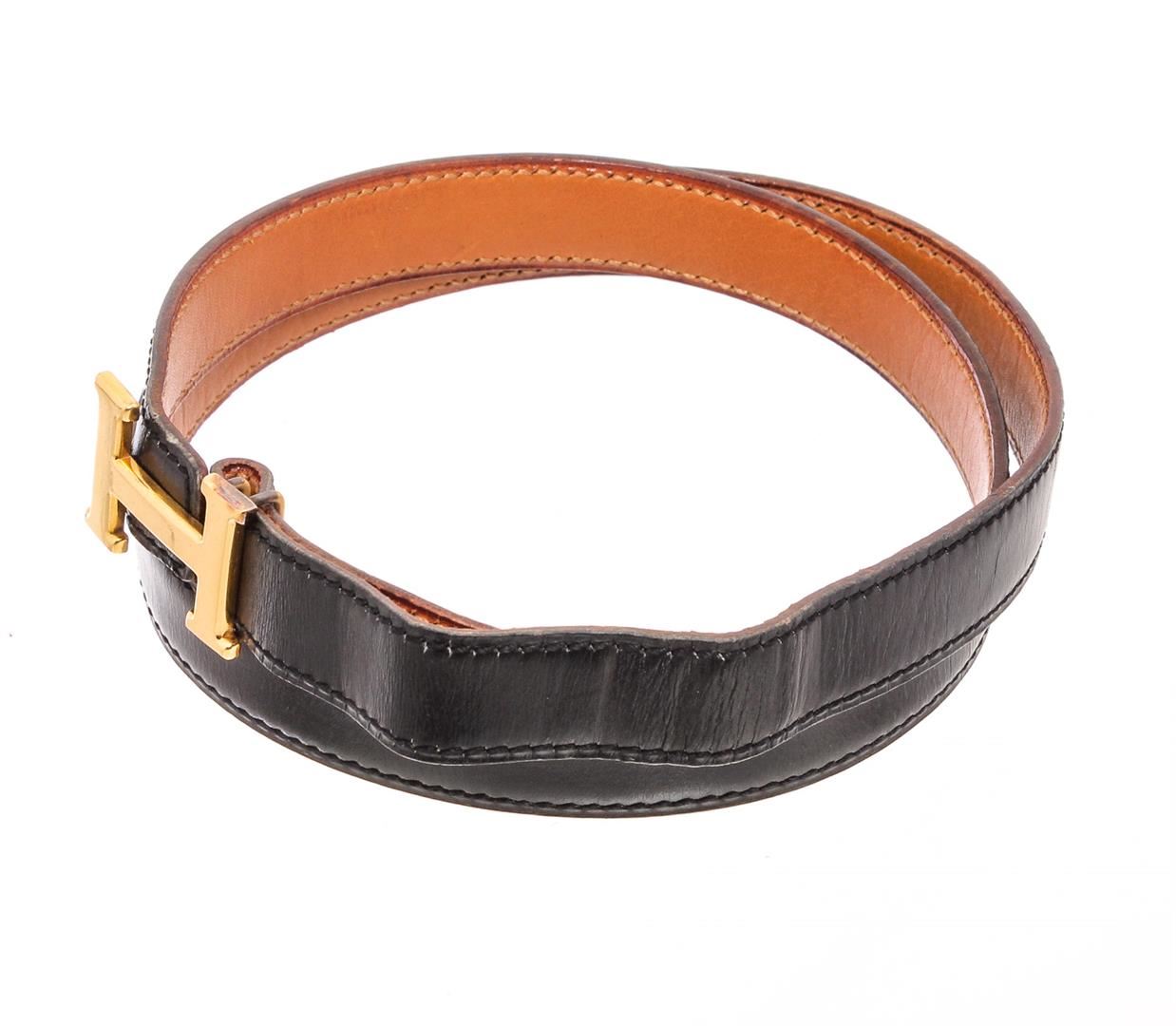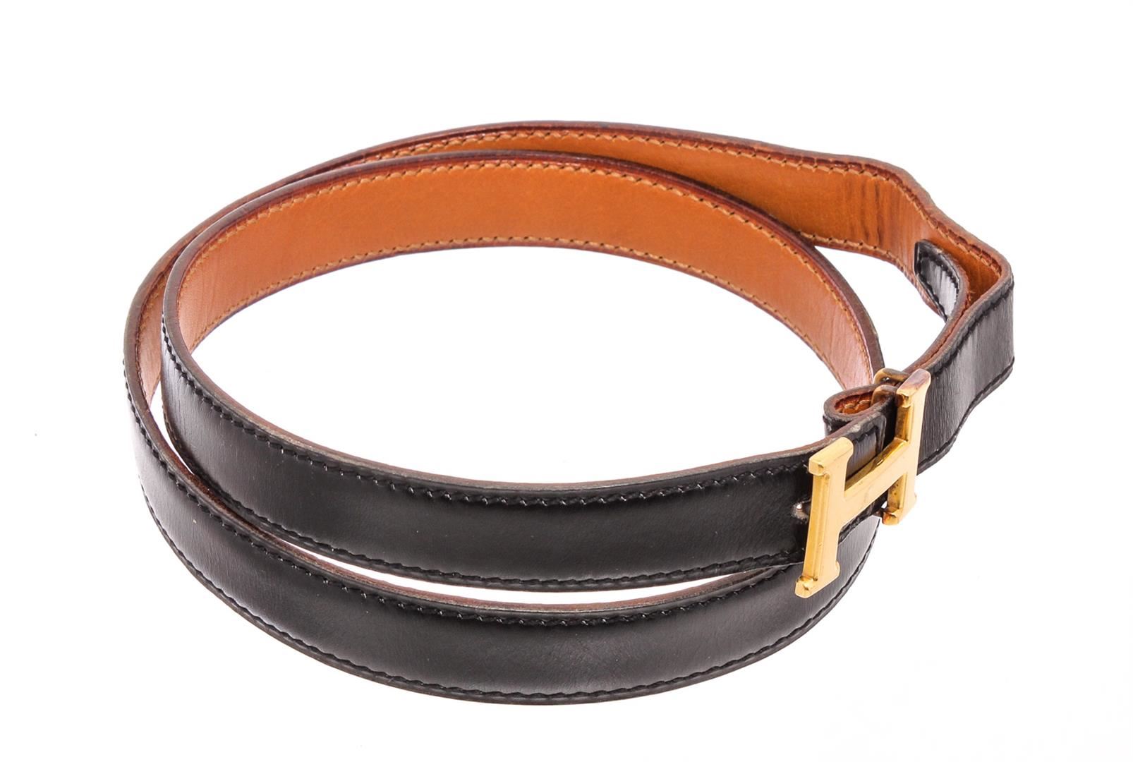 Vintage black and Brown leather Hermes Reversible skinny belt with gold-plated H buckle.
