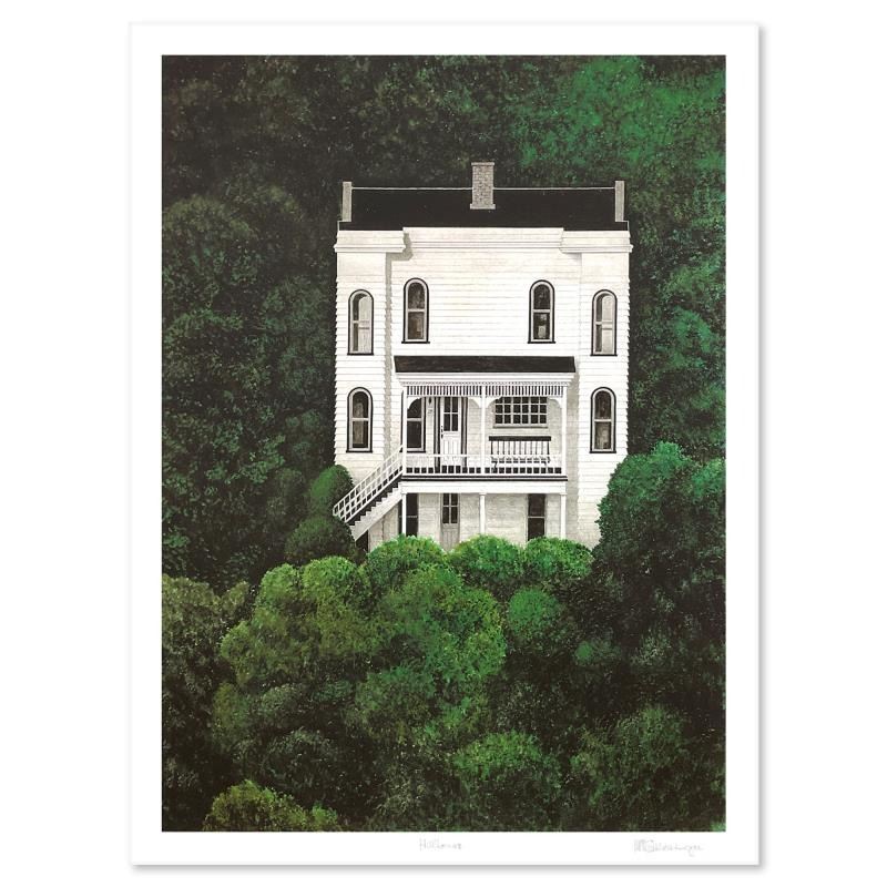 "Hillhouse" is a limited edition serigraph on paper by William Schlesinger (1915-2011), numbered and hand signed by the artist. Includes Letter of Authenticity. Measures approx. 23" x 30" (border), 19" x 26" (image). Due to the age of this piece there may be very minor imperfections on the paper.