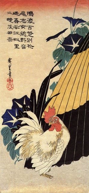 Artist: Utagawa Hiroshige - Title: Cock, Umbrella and Morning Glory - Medium: Fine Art Giclee on Canvas - Image Size: Approximately 20 inches x 9.25 inches - Unframed on Unstretched Canvas - Biography: (1797 - 12 October 1858) Hiroshige 's print s convey the beauty of Japan and provide insight into the everyday life of its citizens during the Edo period. The appeal of his tender, lyrical landscapes was not restricted to the Japanese audience.Hiroshige 's work had a profound influence on the Impressionists and Post-Impressionists of Europe: Toulouse-Lautrec was fascinated withHiroshige 's daring diagonal compositions and inventive use of perspective, while Van Gogh literally copied two ofHiroshig's prints from the famous series, 100 Famous Views of Edo in oil paint. - The borders may not be even inHiroshig's images. Please refer to the image.
