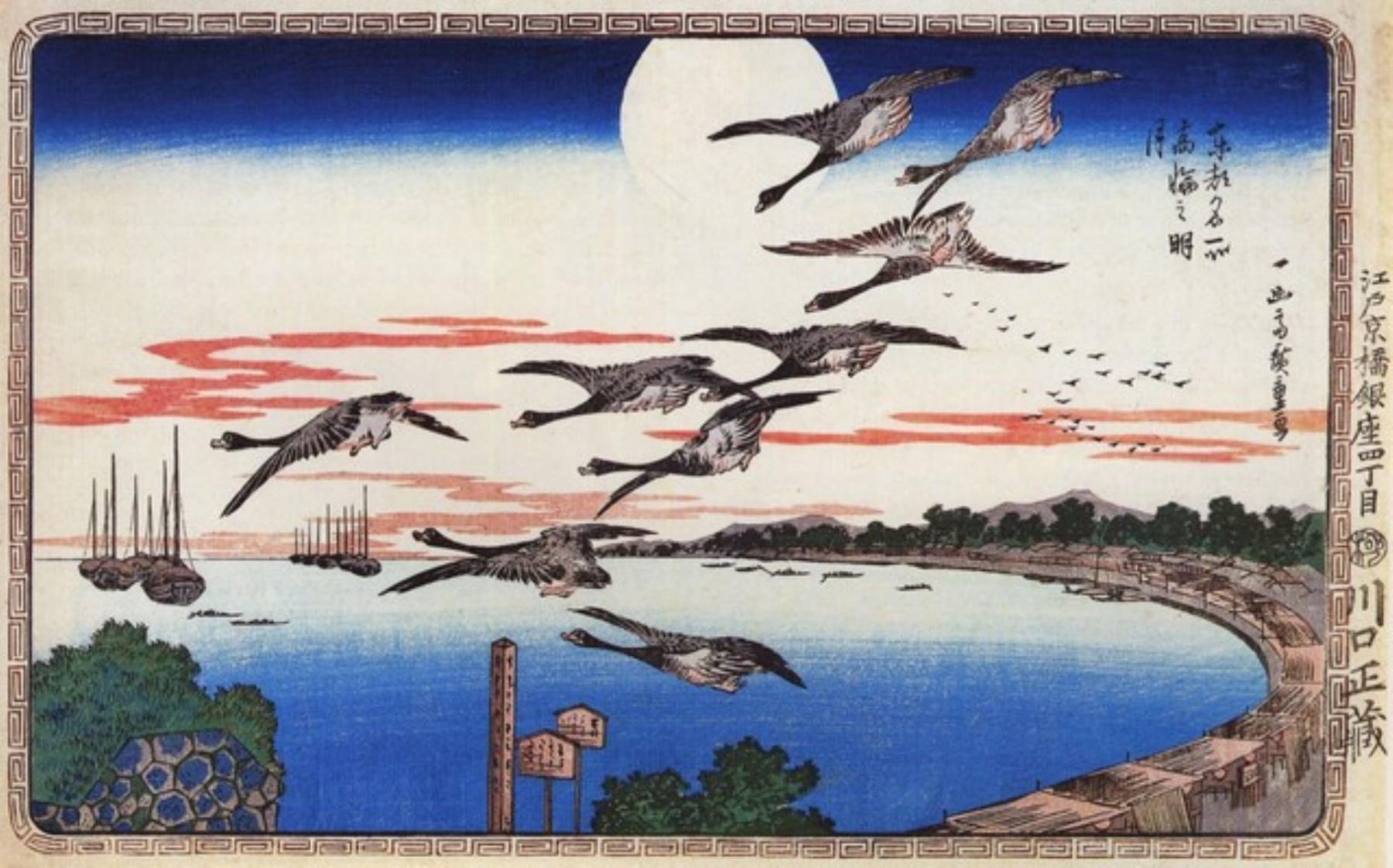 Artist: Utagawa Hiroshige - Title: Geese Descending Over a Bay - Medium: Fine Art Giclee on Canvas - Image Size: Approximately 12.5 inches x 20 inches - Unframed on Unstretched Canvas - Biography: (1797 - 12 October 1858) Hiroshige 's print s convey the beauty of Japan and provide insight into the everyday life of its citizens during the Edo period. The appeal of his tender, lyrical landscapes was not restricted to the Japanese audience.Hiroshige 's work had a profound influence on the Impressionists and Post-Impressionists of Europe: Toulouse-Lautrec was fascinated withHiroshige 's daring diagonal compositions and inventive use of perspective, while Van Gogh literally copied two ofHiroshig's prints from the famous series, 100 Famous Views of Edo in oil paint. - The borders may not be even inHiroshig's images. Please refer to the image.