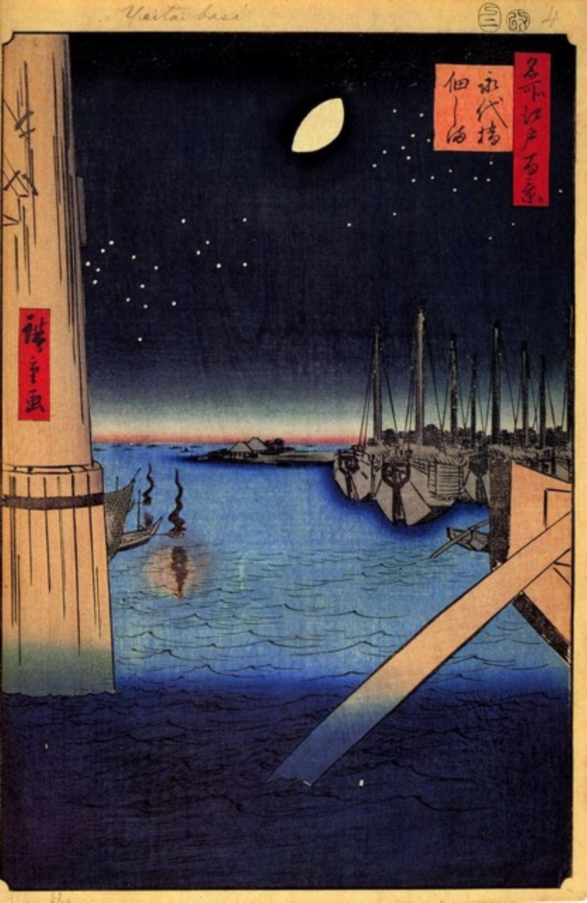 Artist: Utagawa Hiroshige - Title: Tsukudajima from Eitai Bridge - Medium: Fine Art Giclee on Canvas - Image Size: Approximately 32 inches x 20.75 inches - Unframed on Unstretched Canvas - Biography: (1797 - 12 October 1858) Hiroshige 's prints convey the beauty of Japan and provide insight into the everyday life of its citizens during the Edo period. The appeal of his tender, lyrical landscapes was not restricted to the Japanese audience.Hiroshige 's work had a profound influence on the Impressionists and Post-Impressionists of Europe: Toulouse-Lautrec was fascinated withHiroshige 's daring diagonal compositions and inventive use of perspective, while Van Gogh literally copied two ofHiroshig's prints from the famous series, 100 Famous Views of Edo in oil paint. - The borders may not be even inHiroshig's images. Please refer to the image.