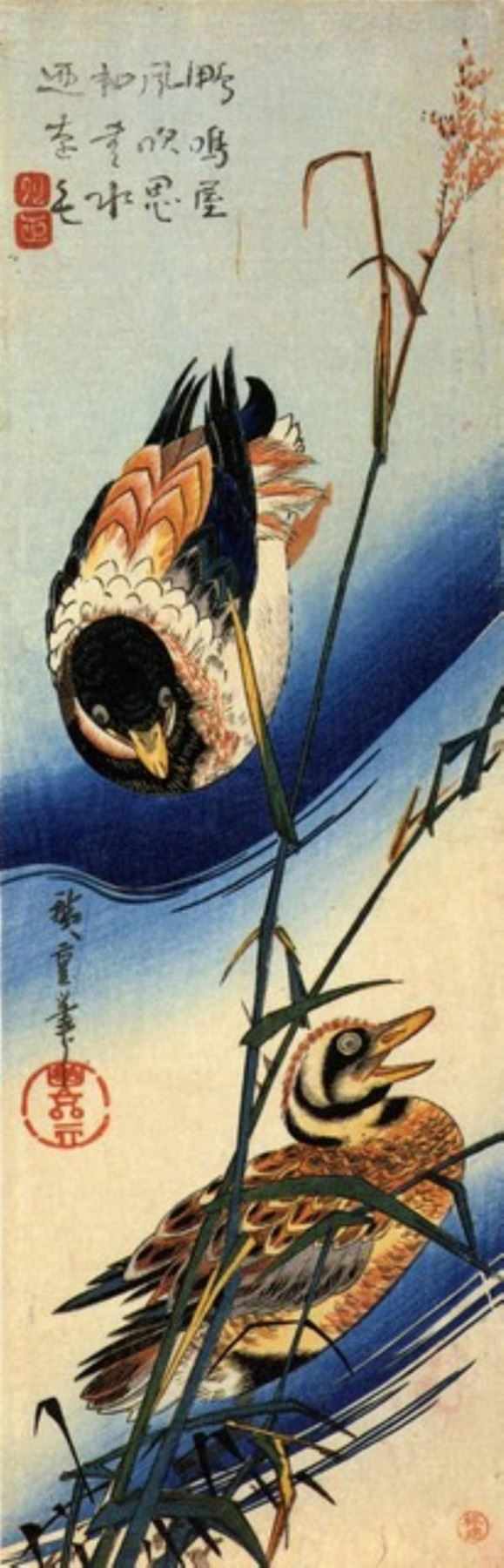 Artist: Utagawa Hiroshige - Title: Two Ducks in Reeds - Medium: Fine Art Giclee on Canvas - Image Size: Approximately 32 inches x 10.25 inches - Unframed on Unstretched Canvas - Biography: (1797 - 12 October 1858) Hiroshige 's print s convey the beauty of Japan and provide insight into the everyday life of its citizens during the Edo period. The appeal of his tender, lyrical landscapes was not restricted to the Japanese audience.Hiroshige 's work had a profound influence on the Impressionists and Post-Impressionists of Europe: Toulouse-Lautrec was fascinated withHiroshige 's daring diagonal compositions and inventive use of perspective, while Van Gogh literally copied two ofHiroshig's prints from the famous series, 100 Famous Views of Edo in oil paint. - The borders may not be even inHiroshig's images. Please refer to the image.