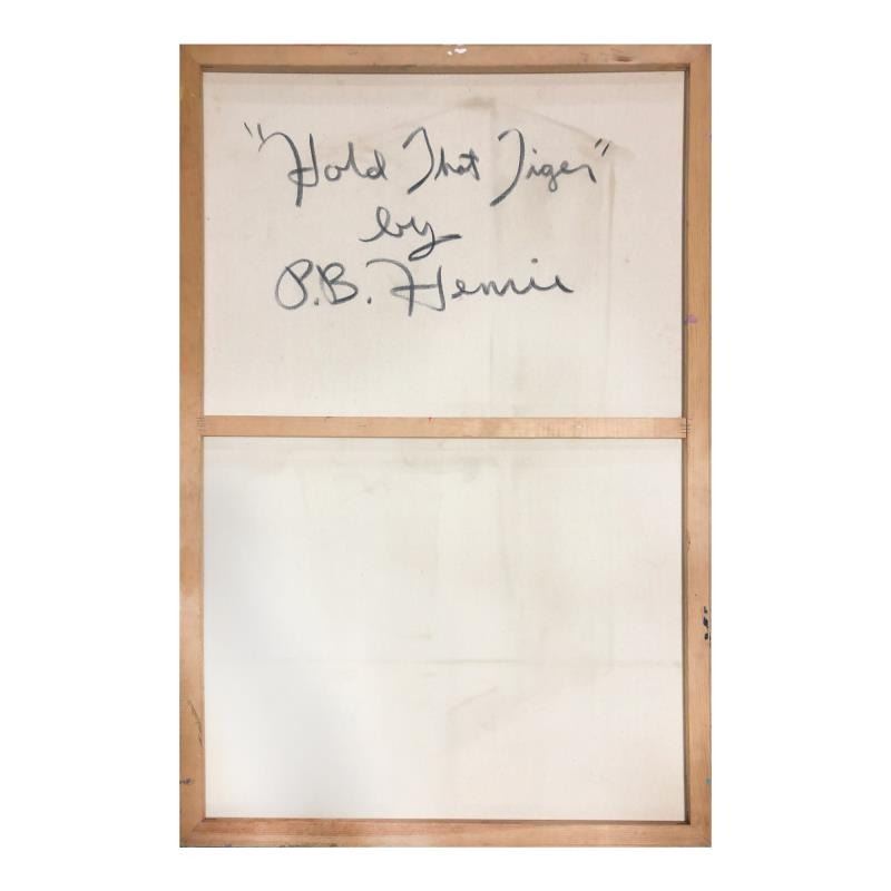 "Hold That Tiger" is an original oil painting on stretched canvas by Paul Blaine Henrie (1932-1999). The piece is hand signed by the artist and comes with a letter of authenticity. Please note that due to the age of this piece and the way it was stored, there are minor sings of wear, particularly on the corners and edges. Measures approximately. 48" x 30" (image).