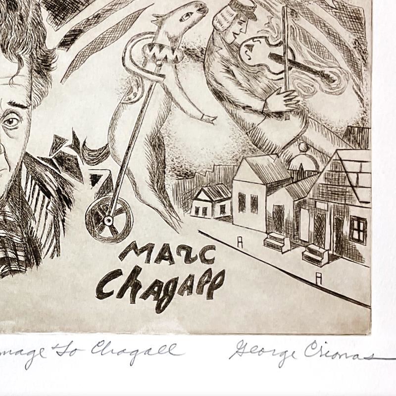 "Homage to Chagall" is a limited edition etching on paper by George Crionas (1925-2004), numbered and hand signed by the artist. Includes Letter of Authenticity. Measures approx. 14" x 11" (border); 9" x 6" (image). There may be imperfections in the border area but the piece is in good condition.