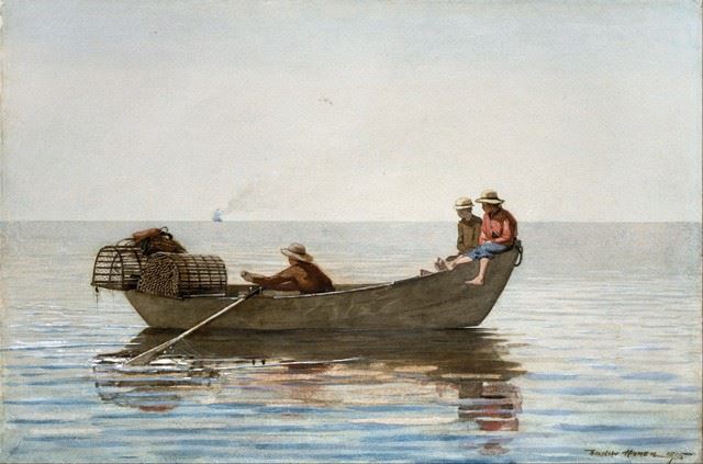 Artist: Winslow Homer - Title: Three Boys in a Dory with Lobster Pots - Medium: Fine Art Giclee on Canvas - Image Size: Approximately 12.25 inches x 20 inches - Framed: Unframed on Unstretched Canvas - Biography: Winslow Homer was born on February 24, 1836, in Boston, Massachusetts. When Homer was six, the family moved to Cambridge, Massachusetts. His mother was a painter and she encouraged Winslow to be artistic. When he was 19 years old, Winslow became an apprentice at John Bufford's lithographic firm. He started by copying other artists' designs. Later, he submitted his own original drawings to magazines, such as Ballou's Pictorial and Harper's Weekly to be published. In 1859, Homer moved to New York City and worked as a freelance illustrator. The next year, several of his paintings were displayed at the National Academy of Design.
