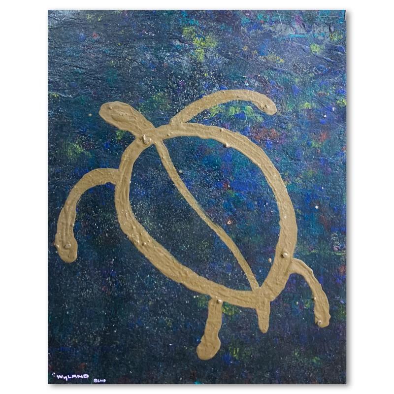 "Honu" is an original painting on board by Wyland. Hand signed by the artist, this piece includes a letter of authenticity. Measures approximately 20" x 16".
