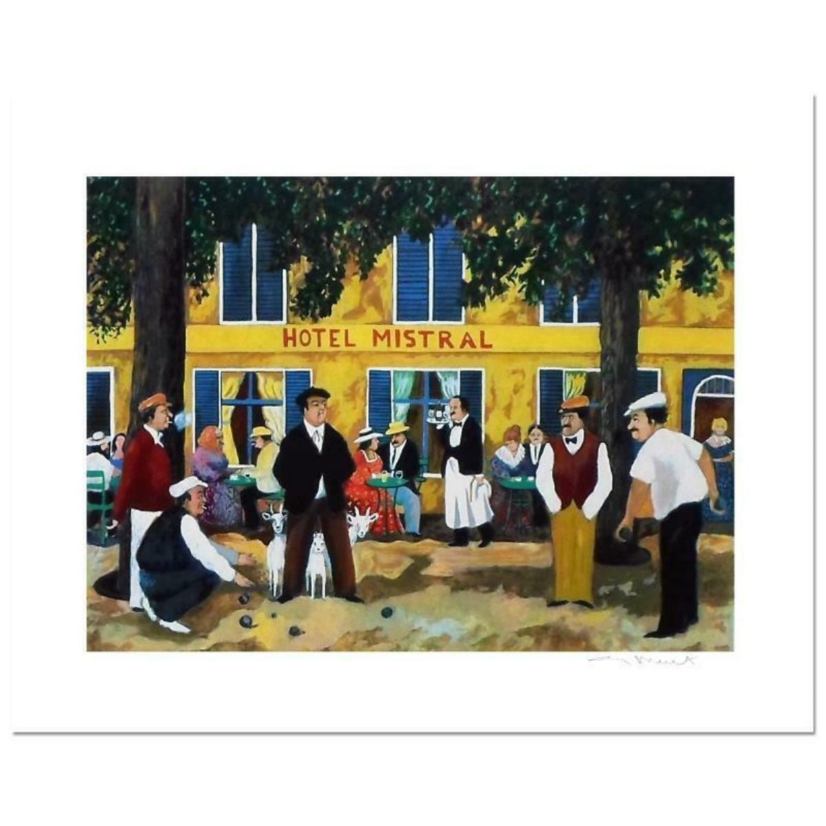 "Hotel Mistral" is a limited edition serigraph on paper by Guy Buffet. It is numbered, hand-signed by the artist, and comes with a Certificate of Authenticity. Measures approx. 23.5" x 17.5" (image).