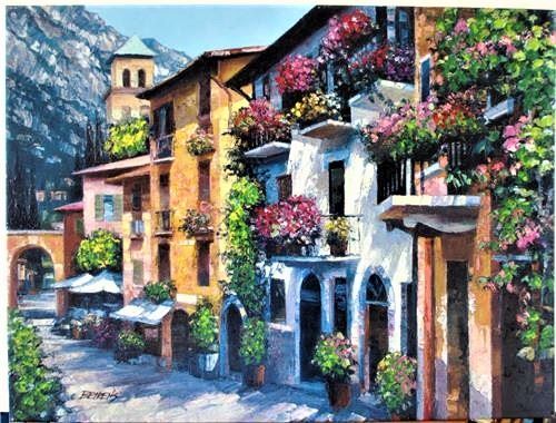 Howard Behrens "VILLAGE HIDEAWAY " Heavily Embellished Hand Signed and Numbered LE Stretched Canvas Giclee, Publisher's Certificate of Authenticity Dimensions: 24 x 32 inches (Note: edition number received may differ from photo)