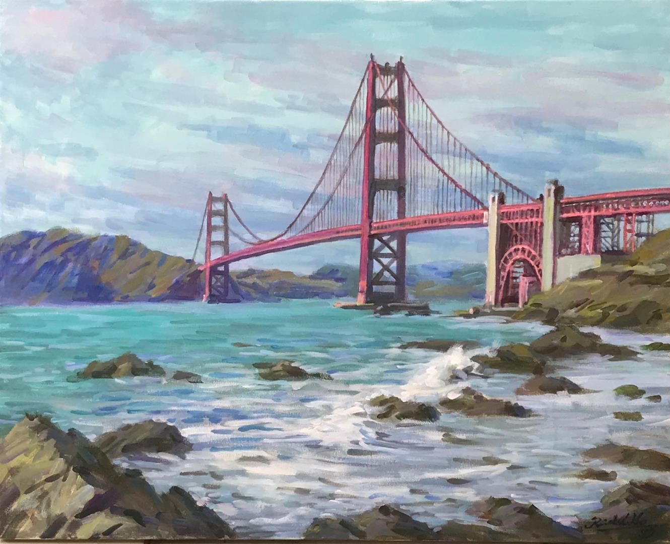 A impressionistic view of the iconic Golden Gate Bridge seen from the SF side. This 24x36" original by Richard Ho is an acrylic on stretched canvas w/COA.