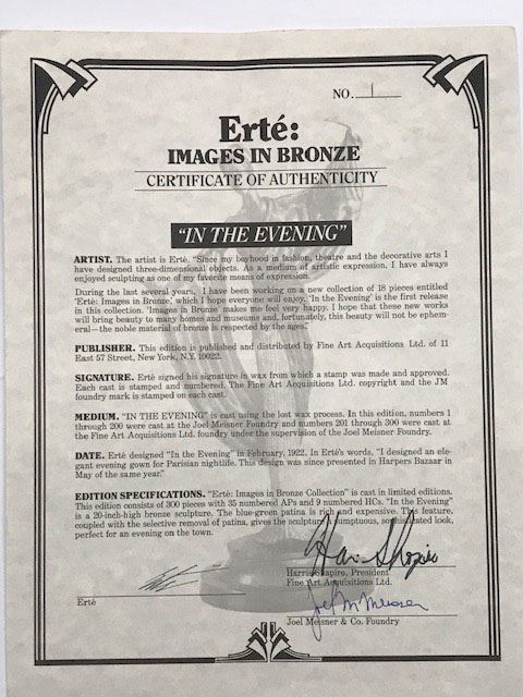"In The Evening" by Erte Bronze. Limited Edition #1 of 300 - 19" x 8" x 6" - Erte designed "In The Evening" in February 1922. In Erte's words "I designed an elegant evening gown for Parisian nightlife. This design was since presented in Harpers Bazaar in May of the same year"