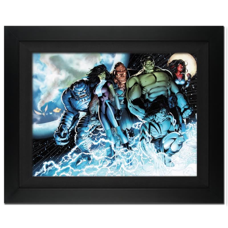 A piece of comic book history, this limited edition, from original art by Barry Kitson, depicting Hulk and She-Hulk. Barry Kitson got his start at Marvel UK by penciling Spider-Man, and now works on the Fantastic Four, Hulk, and Iron Man series. "Incredible Hulks #615" is an extremely limited edition giclee on canvas by Barry Kitson presented by Marvel Comics, hand signed by the great Stan Lee and numbered out of only 10! This piece comes custom framed and ready to hang. Includes Certificate of Authenticity! Measures approx. 31" x 25" (with frame), 24" x 18" (image).