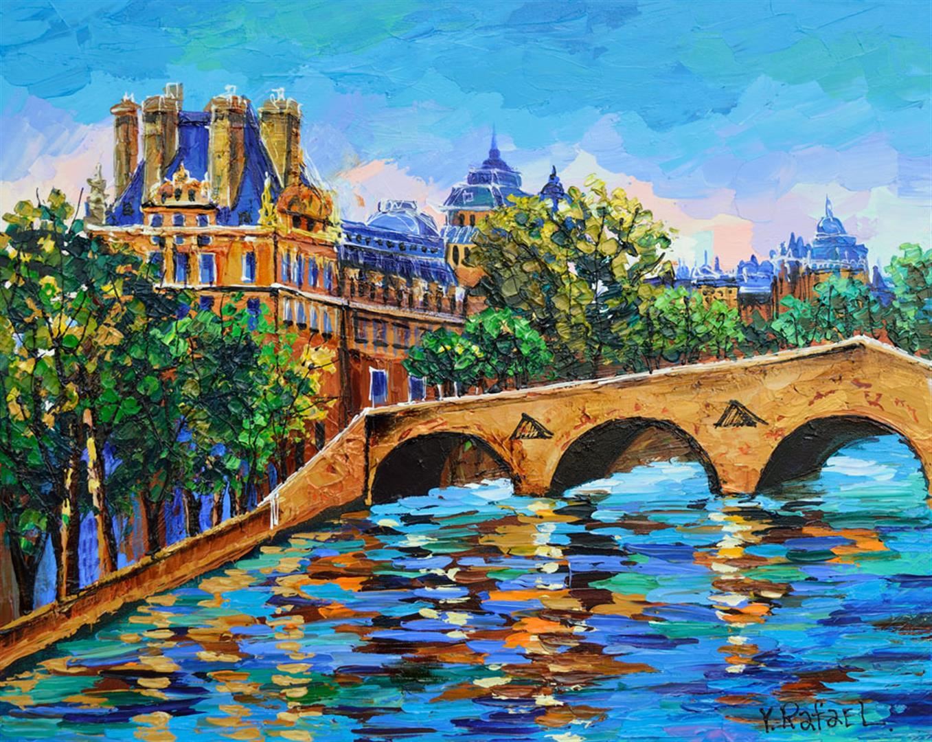 Artist: Yana Rafael - Title: Bridge Waterway - Medium: Acrylic on Canvas - Signature: Hand-signed by the artist at the bottom of the image - Image Size: Approximately 24 inches x 30 inches - Stretched and Ready for Framing - Details: This work comes with a Certificate of Authenticity - Yana Rafael's style is full of vibrant colors and expresses emotions typically associated with bold life. When violent colors are next to each other they trick the eye into a sensation of movement.