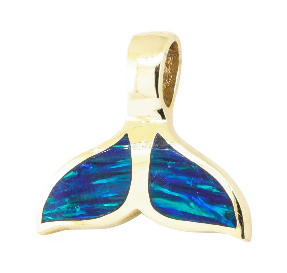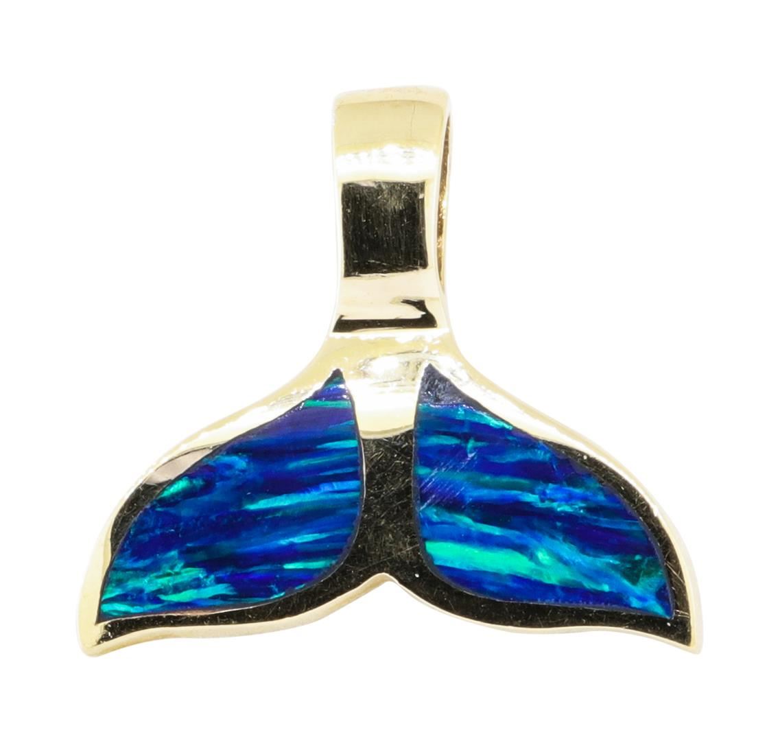 One whale's tail pendant measuring 30mm by 28mm featuring: 14KT yellow gold weighing 9.7 grams containing two inlaid pieces of opal.