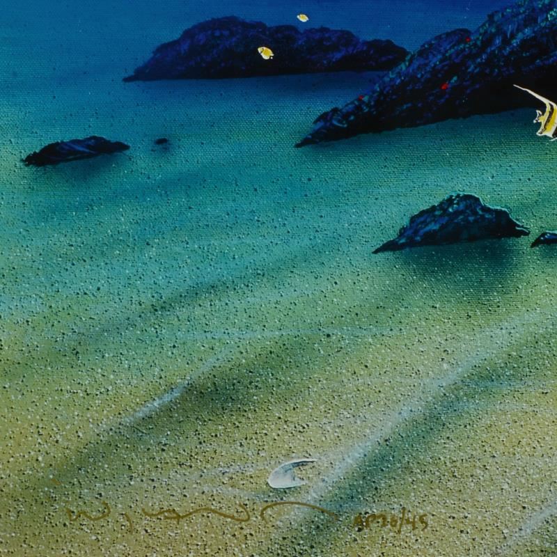 "Island Paradise" is a limited edition cibachrome, AP numbered and hand signed by Wyland and Al Hogue. Includes Certificate of Authenticity and Measures approximately 15" x 30" (image). There is some minor scratching near the signature. Due to the nature of these pieces there may be some imperfections along the edges that would be concealed when framed and due to the glossy surface there may be some smudging in the signature and number area.