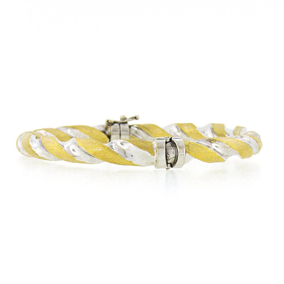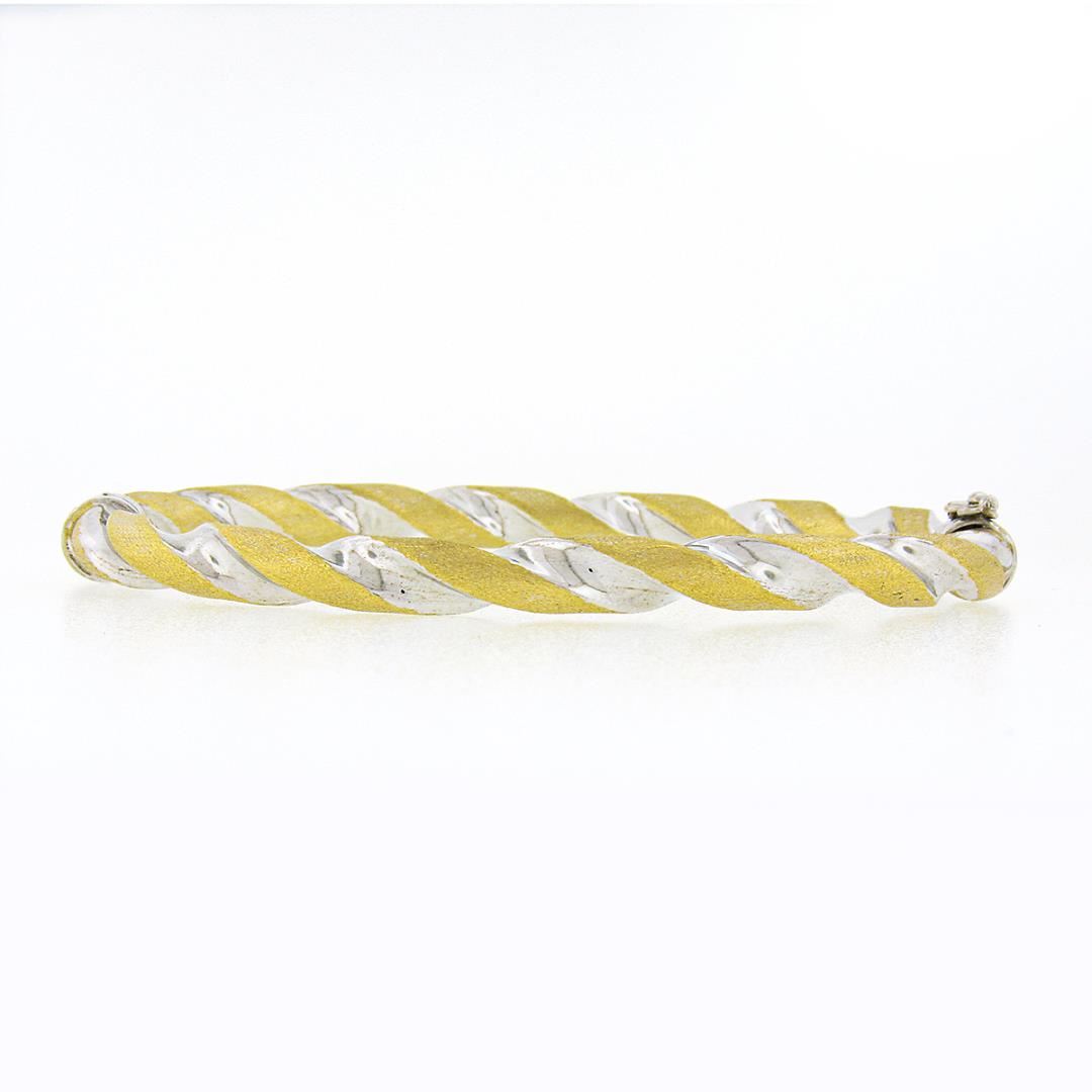 A solid 14k white & yellow gold twisted bangle bracelet. It weighs a total of 11.14 grams, measures 6mm wide, and measures 7 inches in length.