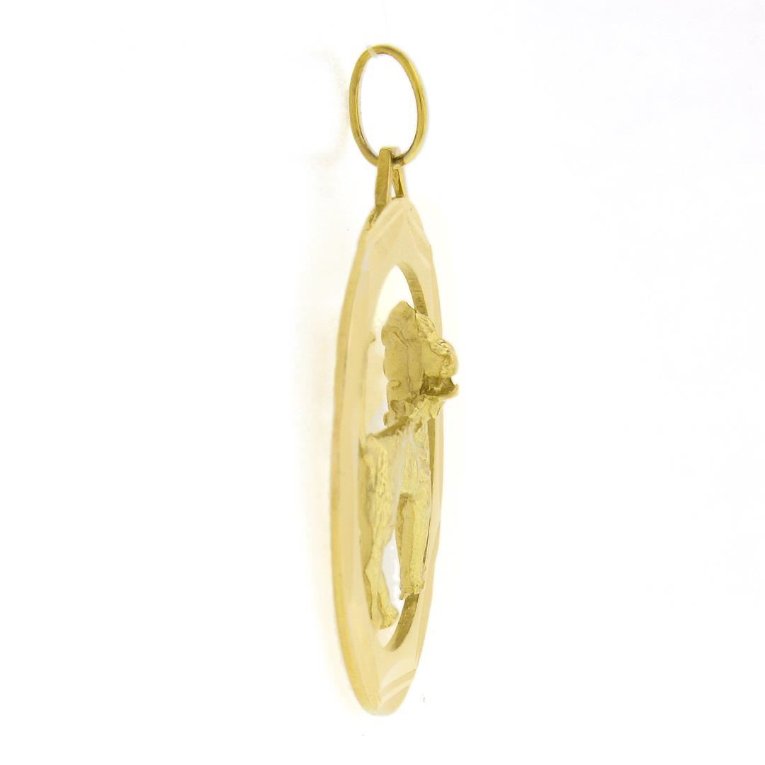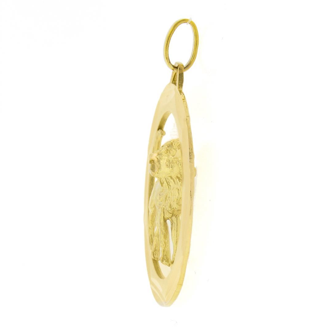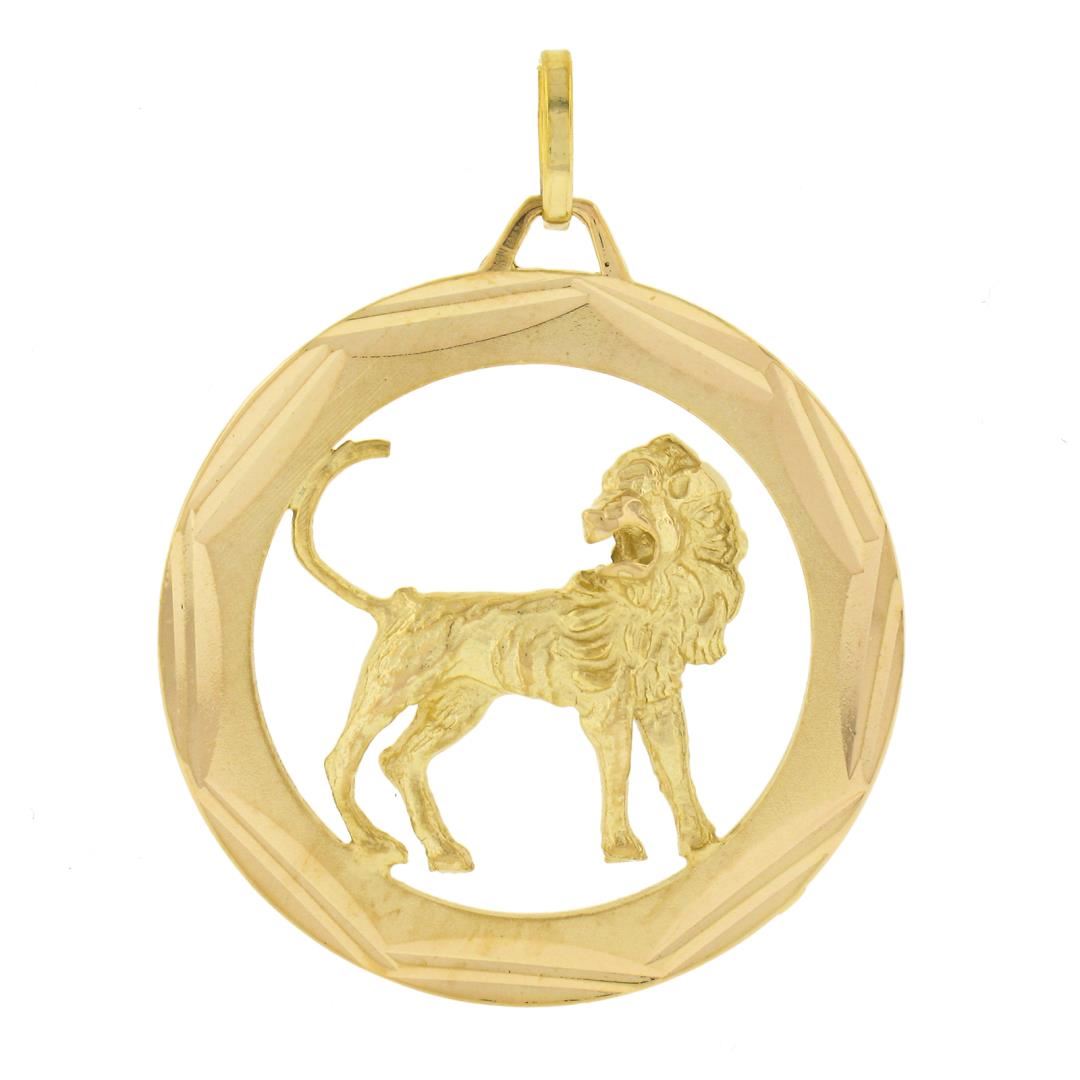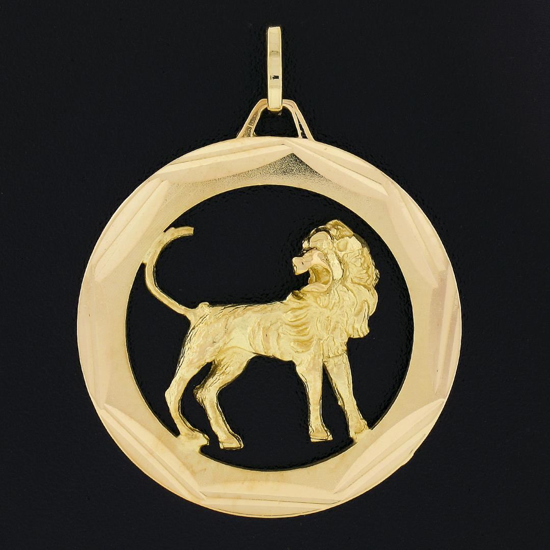 A solid 14k yellow gold lion pendant. The pendant weighs a total of 6.85 grams, measures 38.80x30mm including the bail, and the inside of the bail measures 5.1x3.2mm.