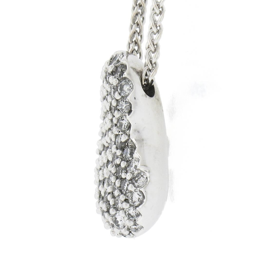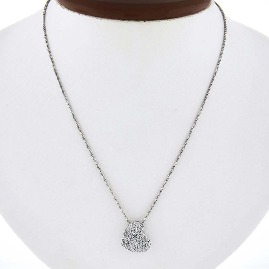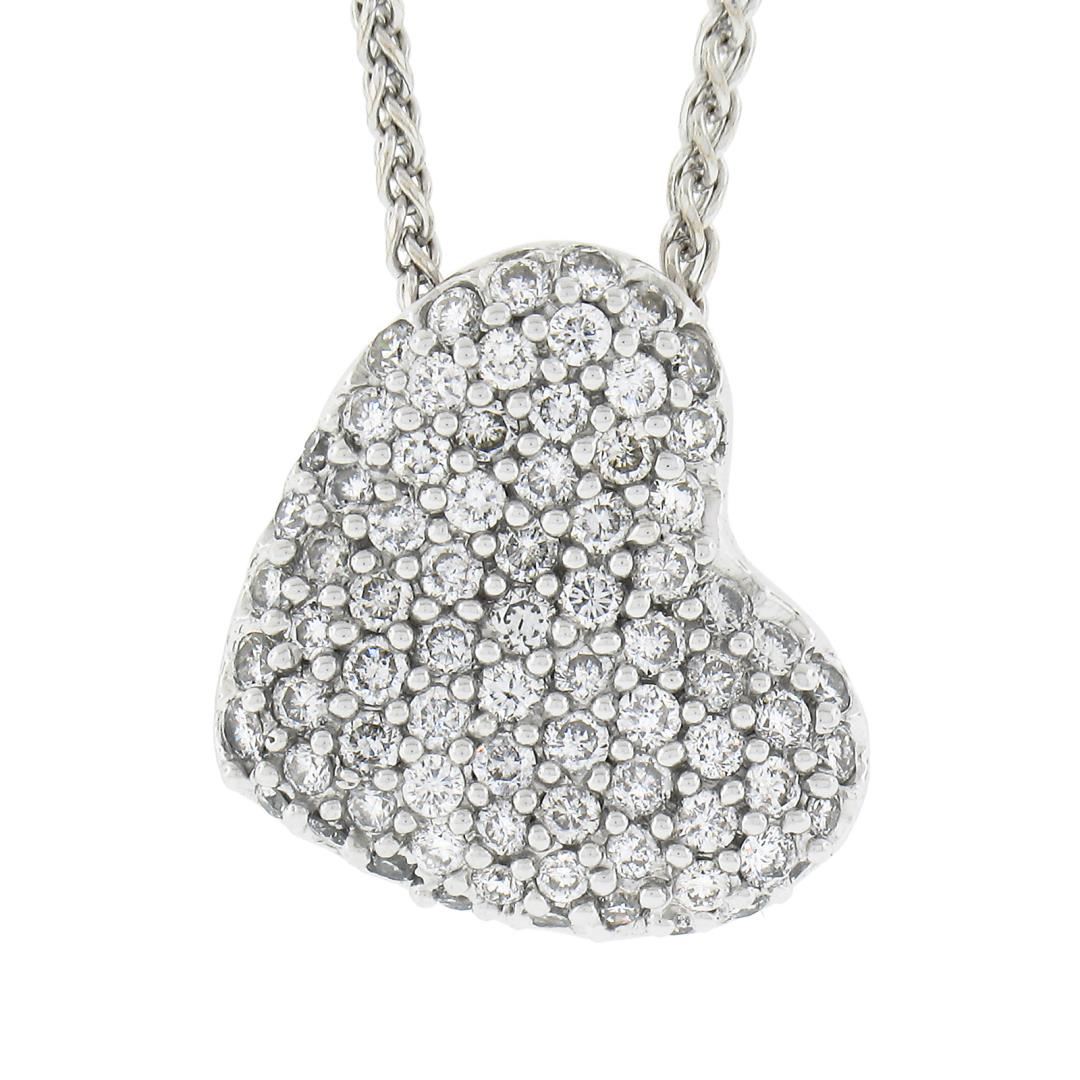 A solid 14k white gold heart pendant necklace, covered with numerous of round cut natural diamonds (G/H - SI1-I2 ; 1.0ctw). The pendant weighs a total of 4.75 grams, measures 14.5x12.6mm including the bail, and 16 inch wheat link chain.