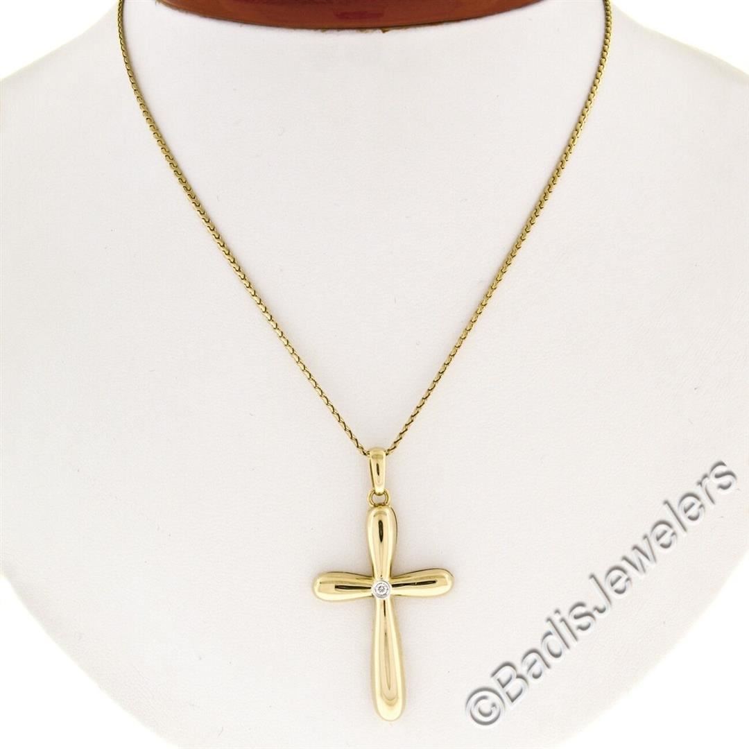 An Italian-made 18kt yellow gold cross pendant with a 6pt round diamond (H - VS2) at its center. 21 inch fancy figure-S link chain, 12.32 grams total weight, measures 44.9x23.4mm.