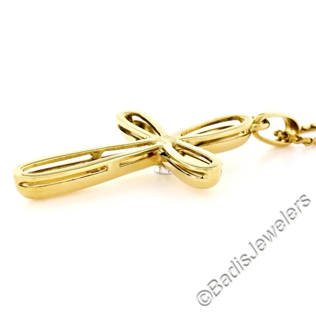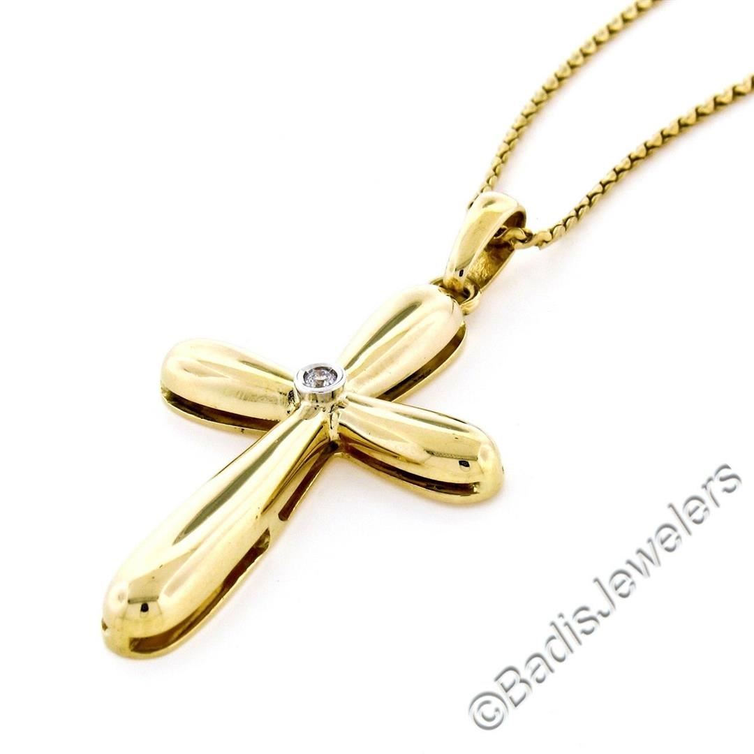 An Italian-made 18kt yellow gold cross pendant with a 6pt round diamond (H - VS2) at its center. 21 inch fancy figure-S link chain, 12.32 grams total weight, measures 44.9x23.4mm.