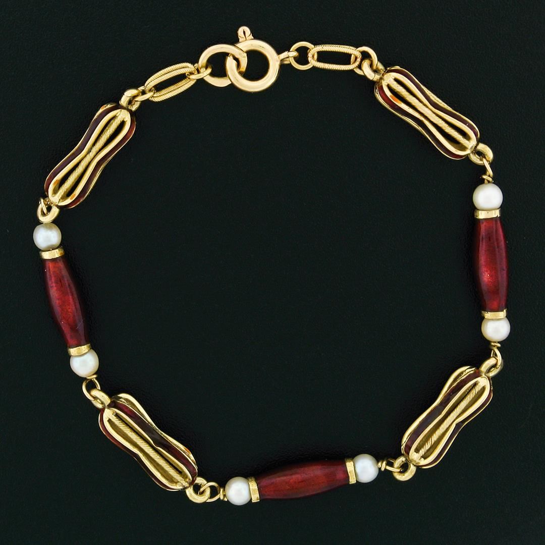 A vintag solid 18k yellow gold and enamel link bracelet, faeturing 6 round shape natural cultured pearls (3.65 - 3.75mm ). It weighs a total of 15.3 grams, and measures 7.5 inches in length.