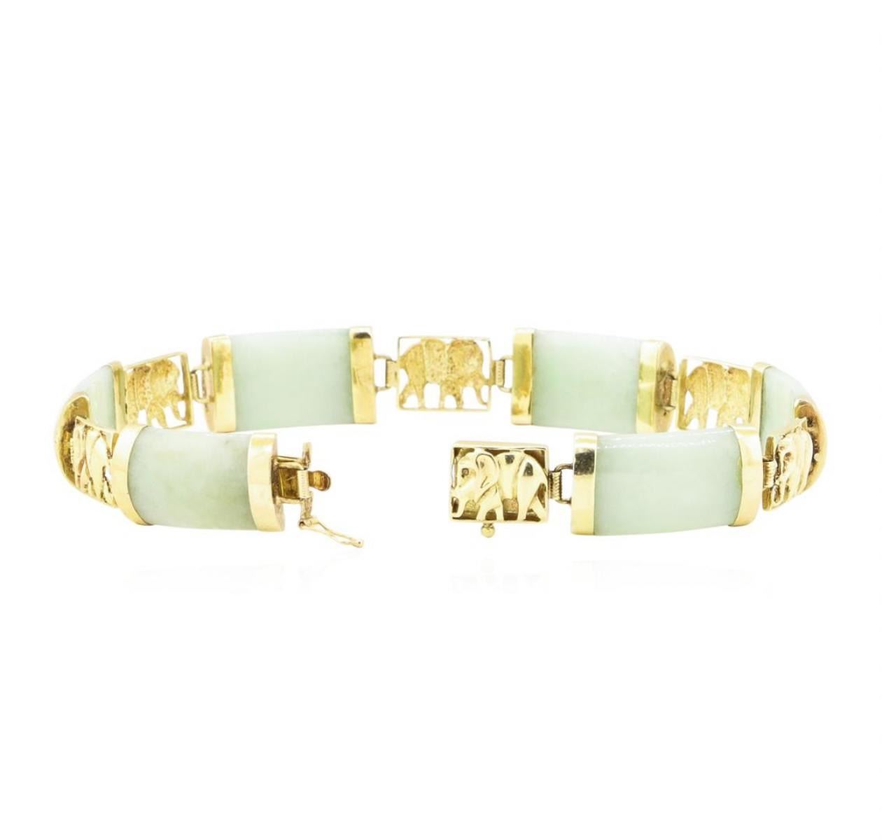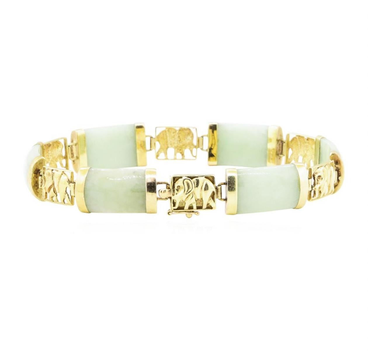 One jade station bracelet measuring seven and three quarter inches in length featuring: 14KT yellow gold weighing 16.5 grams containing six pieces of jade.
