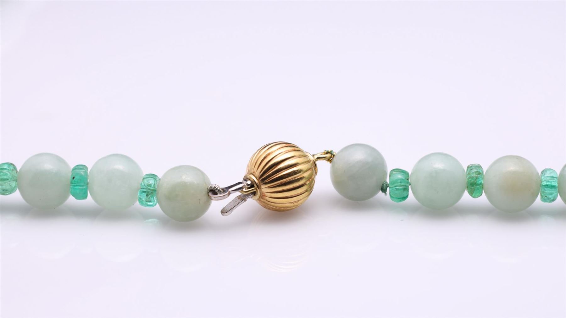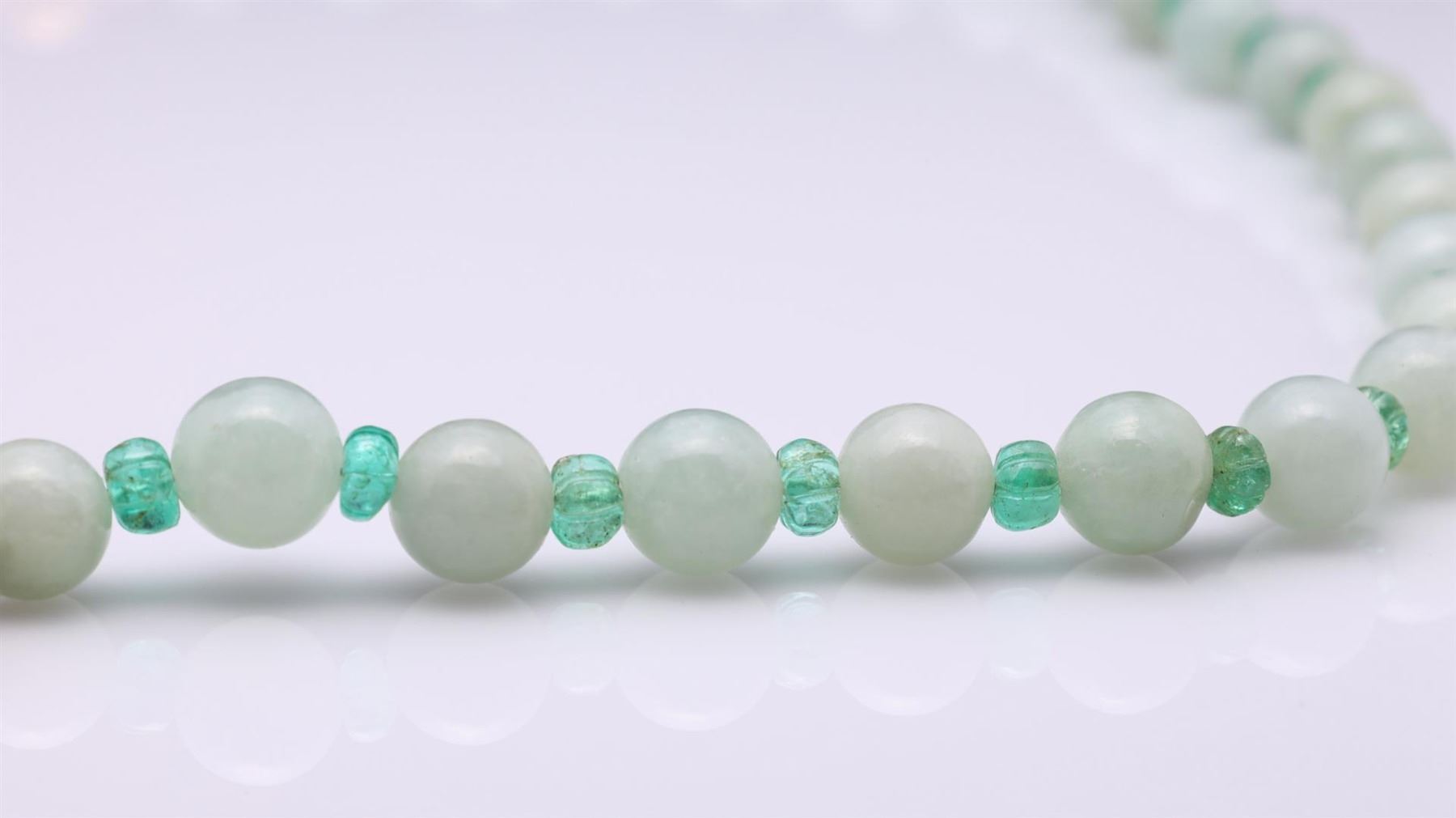 Designed by R. L. Kay; long strand of green jadeite beads, interspersed with bright green emerald roundels and gold clasp of bead form, with pendant in the form of a chrysanthemum with a central diamond, the clasp marked 750, gross weight 64.6g, L 11 inch