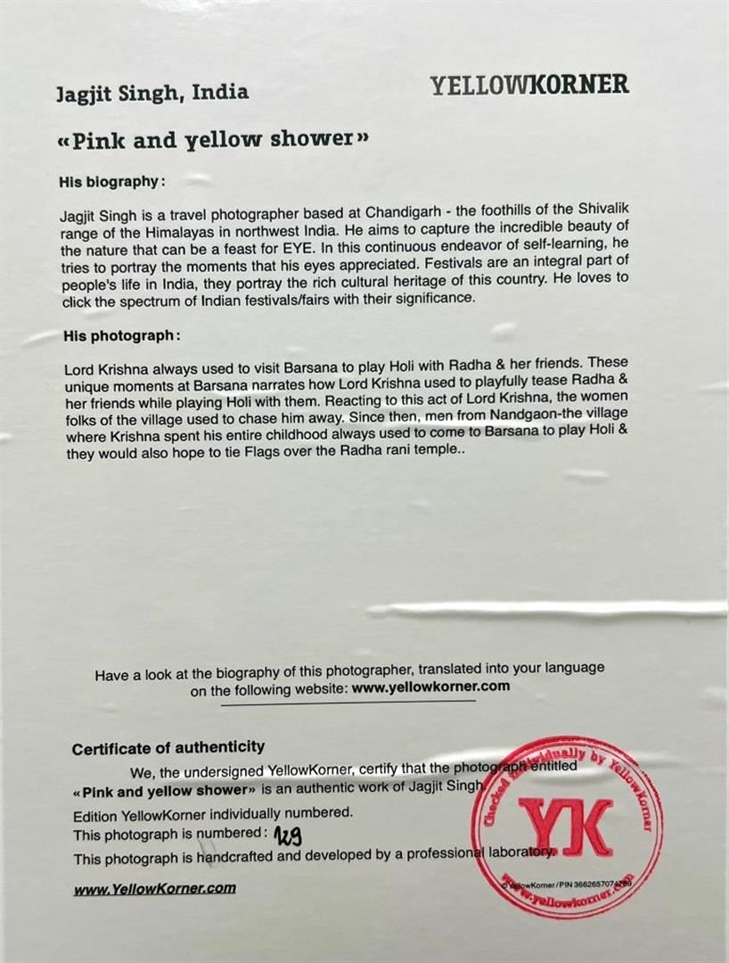 Jagjit Singh India Pink and Yellow Shower YellowKorner Certified Photograph. Certificate of Authenticity from YellowKorner affixed to the back. Matted Dimensions 16"x20". Protected with Clear Mylar Sleeve.