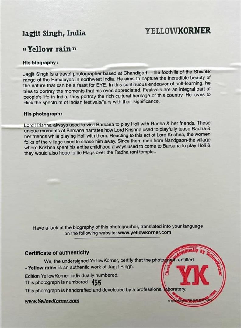 Jagjit Singh India Yellow Rain YellowKorner Certified Photograph. Certificate of Authenticity from YellowKorner affixed to the back. Matted Dimensions 16"x20". Protected with Clear Mylar Sleeve.