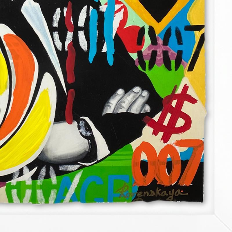 "James Bond" is a one-of-a-kind mixed media on deckle edge paper by Nastya Rovenskaya, Hand signed by the artist. This piece comes floating in a custom frame. Includes Letter of Authenticity. Measures approximately 24" x 20" (framed), 20" x 16" (image).