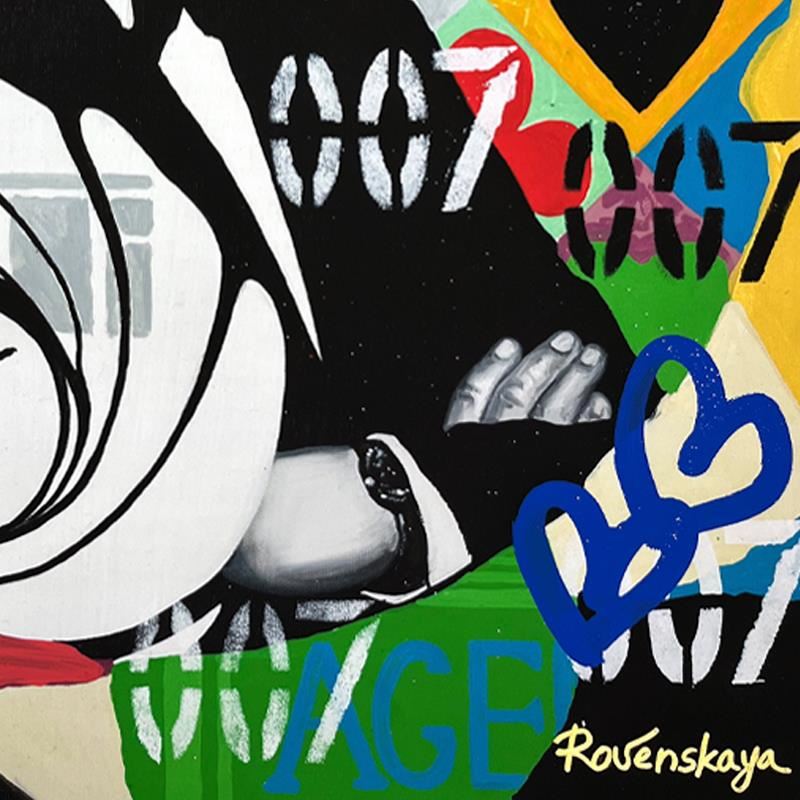 "James Bond" is a one-of-a-kind mixed media on deckle edge paper by Nastya Rovenskaya; hand signed by the artist. This piece comes custom framed and includes letter of authenticity. Measures approximately 36.5" x 30" (framed), 30.5" x 24" (image).